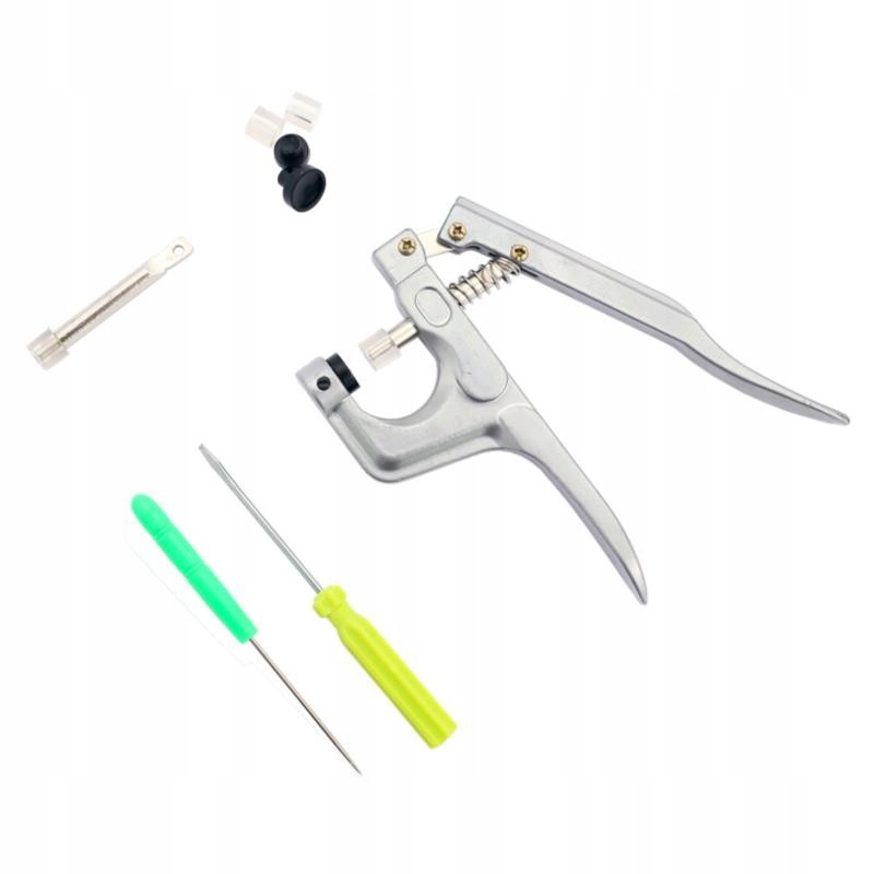 Ручний прес для встановлення пластикових шпильок. Корпус виготовлений з алюмінію, притискний елемент - сталевий штифт. Матриці у формі напівкруглих кнопок виготовлені зі спеціального матеріалу. У набір входить додатковий штифт і набір плашок для застібок з найбільш поширеними діаметрами 10, 12 і 14 мм.