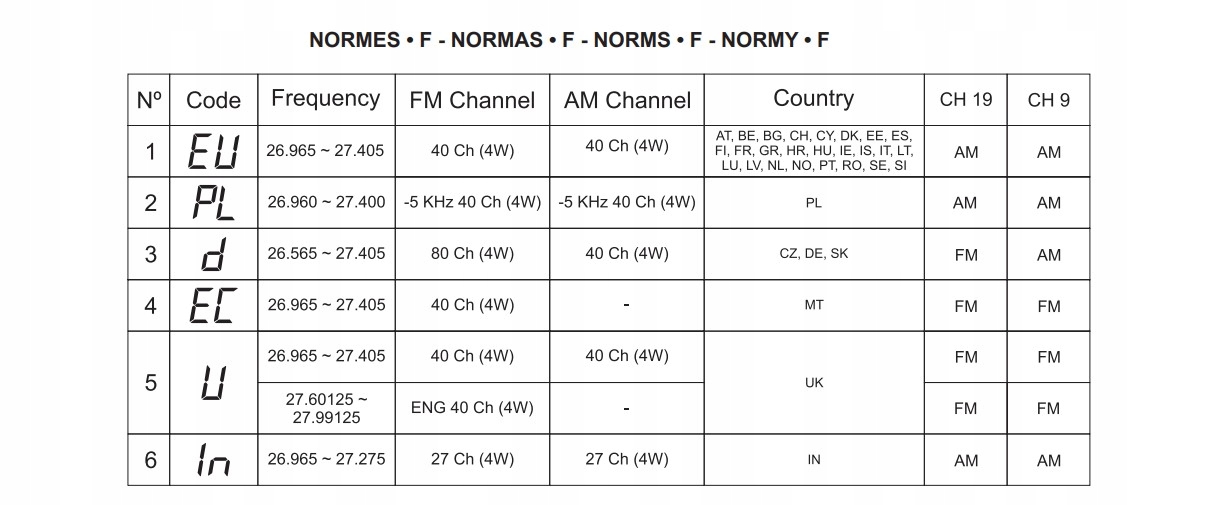 - діапазони частот: від 26,965 МГц до 27,405 МГц (у режимі експорту 24,710 - 30,100 МГц)