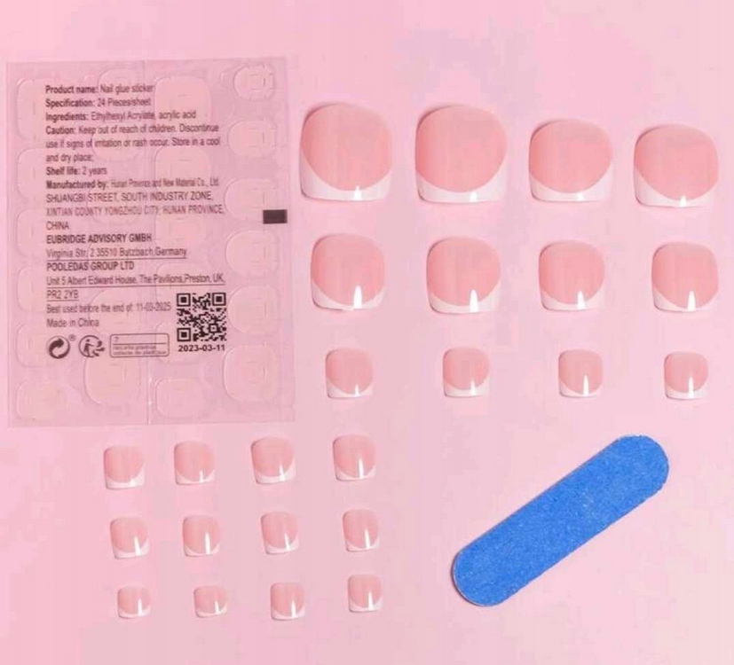 У комплект входить 24 нігті 12 розмірів, наклейка (двосторонній скотч для приклеювання нігтя) і міні-пилка