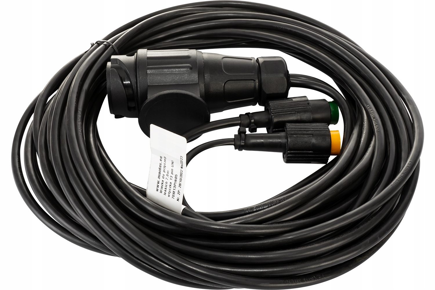 - 13-контактний електричний кабель причепа має довжину 7 метрів із поперечним перерізом жили 0,5 мм і підходить для електроустановки в причепах автомобільних, будівельних, човнових, міні-екскаваторів і евакуаторів.