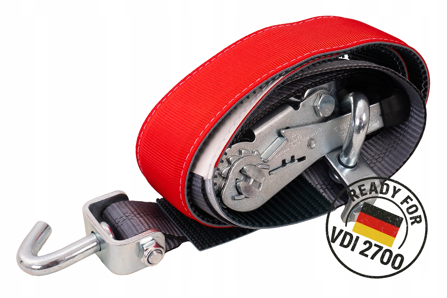 Директива VDI 2700 Частина 8.1 - це німецький технічний стандарт, що визначає детальні вимоги до для захисту транспортних засобів, що транспортуються на буксирних вантажівках та причепах . Що стосується ременів вкладення, з обгортанням кола, ця директива визначає, серед інших методів розподілу ременів, необхідну кількість точок монтажу (наприклад, 3-бальна система), мінімальні параметри напруги та правила для їх маркування та технічного прийому. Відповідність VDI 2700 8.1 означає, що ремені відповідають суворим вимогам у галузі безпеки, надійності та ефективності іммобілізації транспортного транспортного засобу , що має вирішальне значення для професійного транспортування пасажирських автомобілів та фургонів. Завдяки цьому, користувач впевнений, що система кріплення відповідає нинішнім європейським та німецьким стандартам у галузі безпеки дорожнього руху.