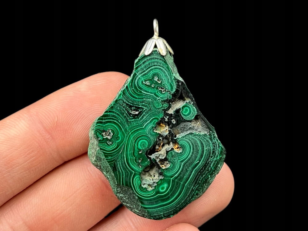 підвіска, виготовлений з природного шматочка малахіту з характерним зеленим малюнком. Мінерал відшліфований і відшліфований з двох боків, завдяки якому він гладкий і приємний до дотику до шкіри і привертає око -освітлення. Вражаючі ювелірні вироби з Малахіту пам’ятають тривалий час, вважається, що цей мінерал покращує концентрацію і допомагає нам залишатися спокійними. Гачок металевий і срібний. Розміри Малахіту: 4,7 см х 3,4 см х 0,5 см. Вага: 16г. На фотографіях показаний пропонований мінерал з двох сторін.