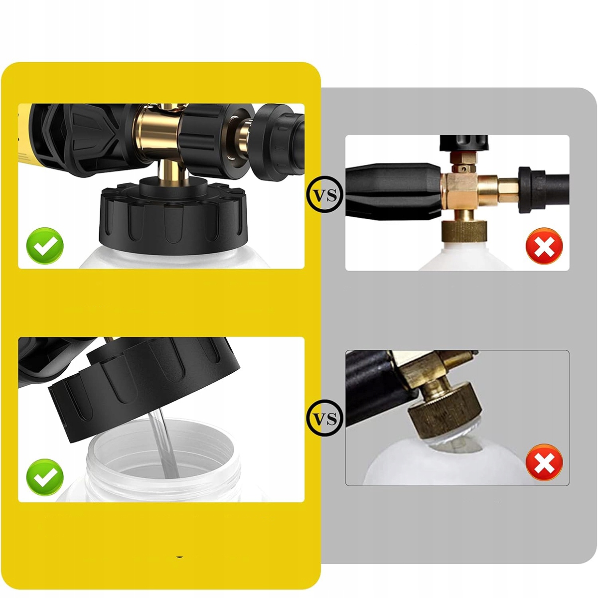 [вдосконалена пінопласт]: 1. Зроблено з міцної латуні та високоякісного пластику, запобігає корозії та забезпечує щільну герметизацію, тому вам не доведеться турбуватися про витоки; 2. Підсилена широка шия запобігає розтріскуванню і її легко заповнити милом і водою. 3. Легка заміна відкриваючої насадки-просто відкрутіть жіночу нитку M22 на чорний адаптер до Karcher, ви можете перевірити його стан і замінити.