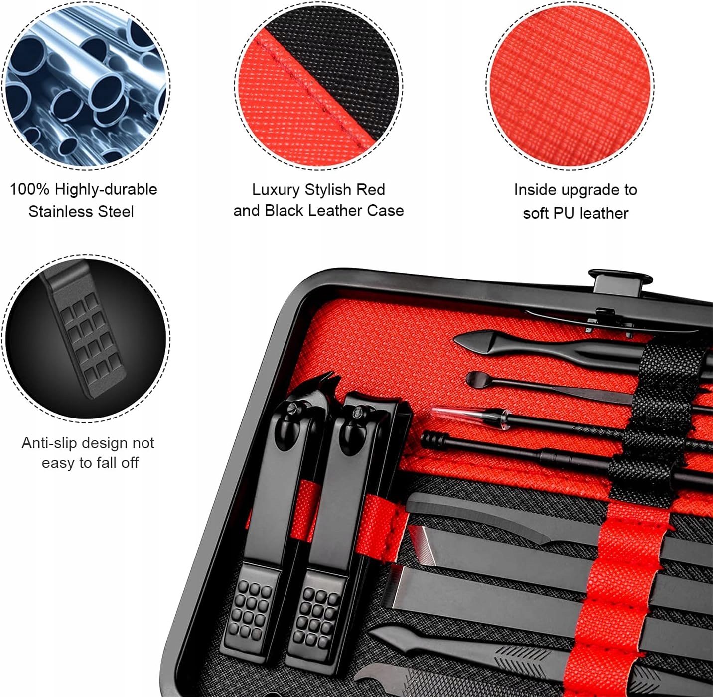Професійний манікюрний набір, педикюрний набір, 18 предметів, нержавіюча сталь, інструменти для догляду за нігтями зі шкіряною дорожньою сумкою (чорно-червоний колір)