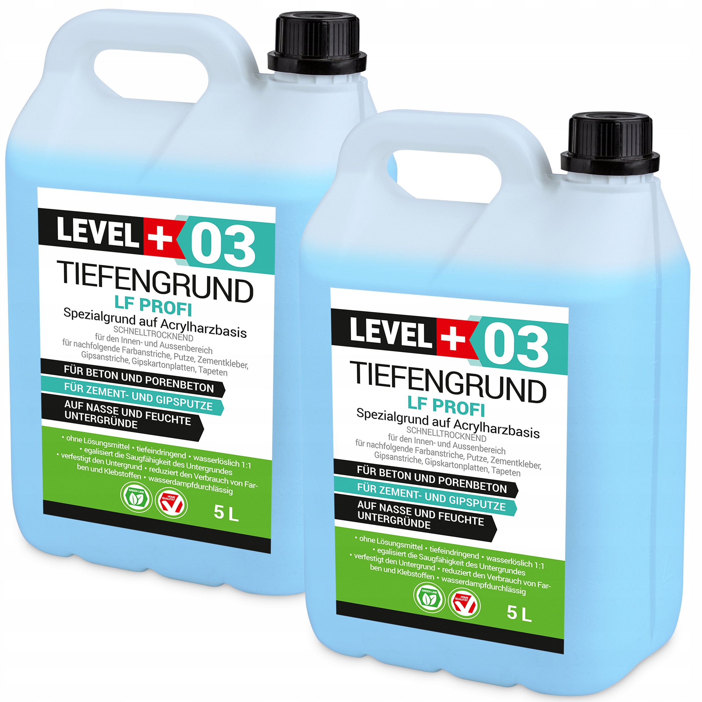 TIEFENGRUND LF PROFI +03 використовується як грунтовка для зміцнення основи та підвищення адгезії наступних шарів, що наносяться на її поверхню. Рекомендується використовувати на старих і нових сильно вбираючих основах, таких як: бетон, газобетон, штукатурка (вапняно-цементна, вапняна, гіпсова), плити (цемент, гіпс, гіпсокартон). Може використовуватися в конструкціях теплої підлоги. Ідеально підходить як грунт для гіпсових штукатурок і шпаклівок, гіпсових шпаклівок, клеїв і гіпсових штукатурок, для фарб, цементних штукатурок, шпалер, стяжок і самовирівнювальних стяжок. Може використовуватися під полімерні та полімерцементні покриття та гідроізоляційні мембрани. Для цементних і дисперсійних клеїв для керамічної плитки, всіх видів акрилових і мінеральних штукатурок. Продукт призначений, зокрема, як ґрунтувальний шар для одно- та двокомпонентних полімерних і полімерцементних покриттів - гідроізоляційних мембран LEVEL PLUS. Можна використовувати на вертикальних і горизонтальних поверхнях, всередині і на вулиці. У випадку з поверхнями зі зниженою вбираючою здатністю його можна розбавити водою у співвідношенні 1:1. Продукт не містить коалесентів і розчинників. Після висихання практично не утворює покриття та викликає гідрофобізацію основи. Продукт є паропроникним. Не має негативного впливу на природне середовище.