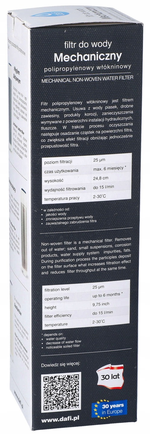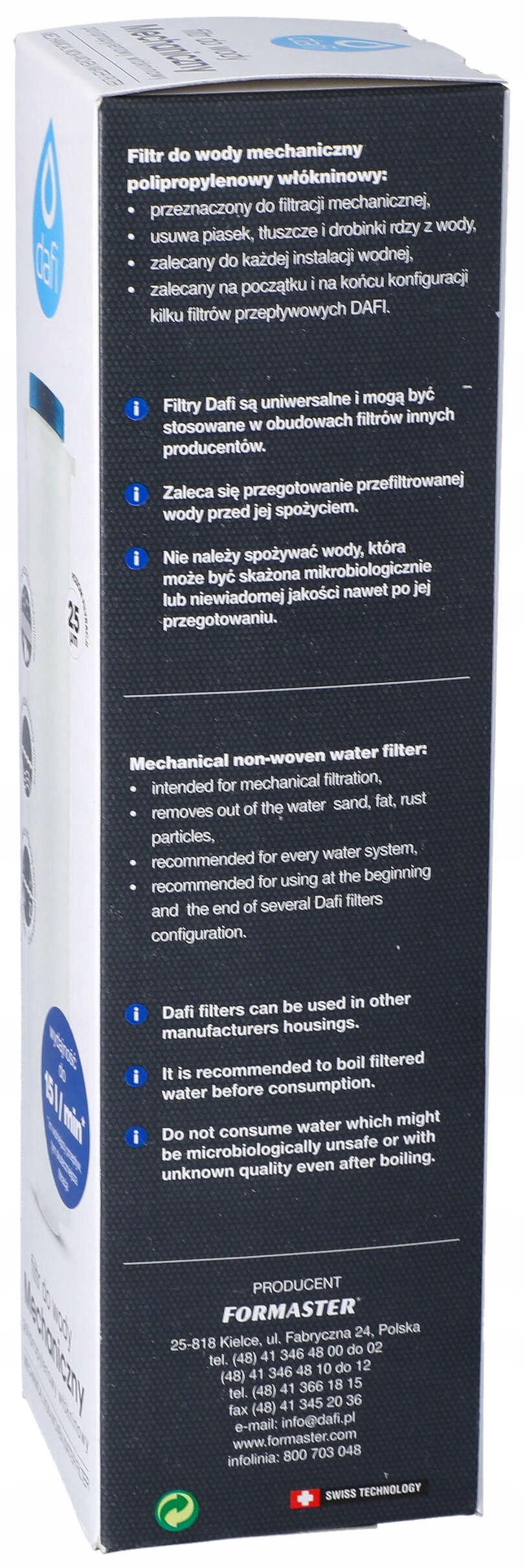 - Фільтрація з активованого вугілля рекомендується передувати механічній фільтрації (за допомогою поліпропіленового фільтра Dafi)