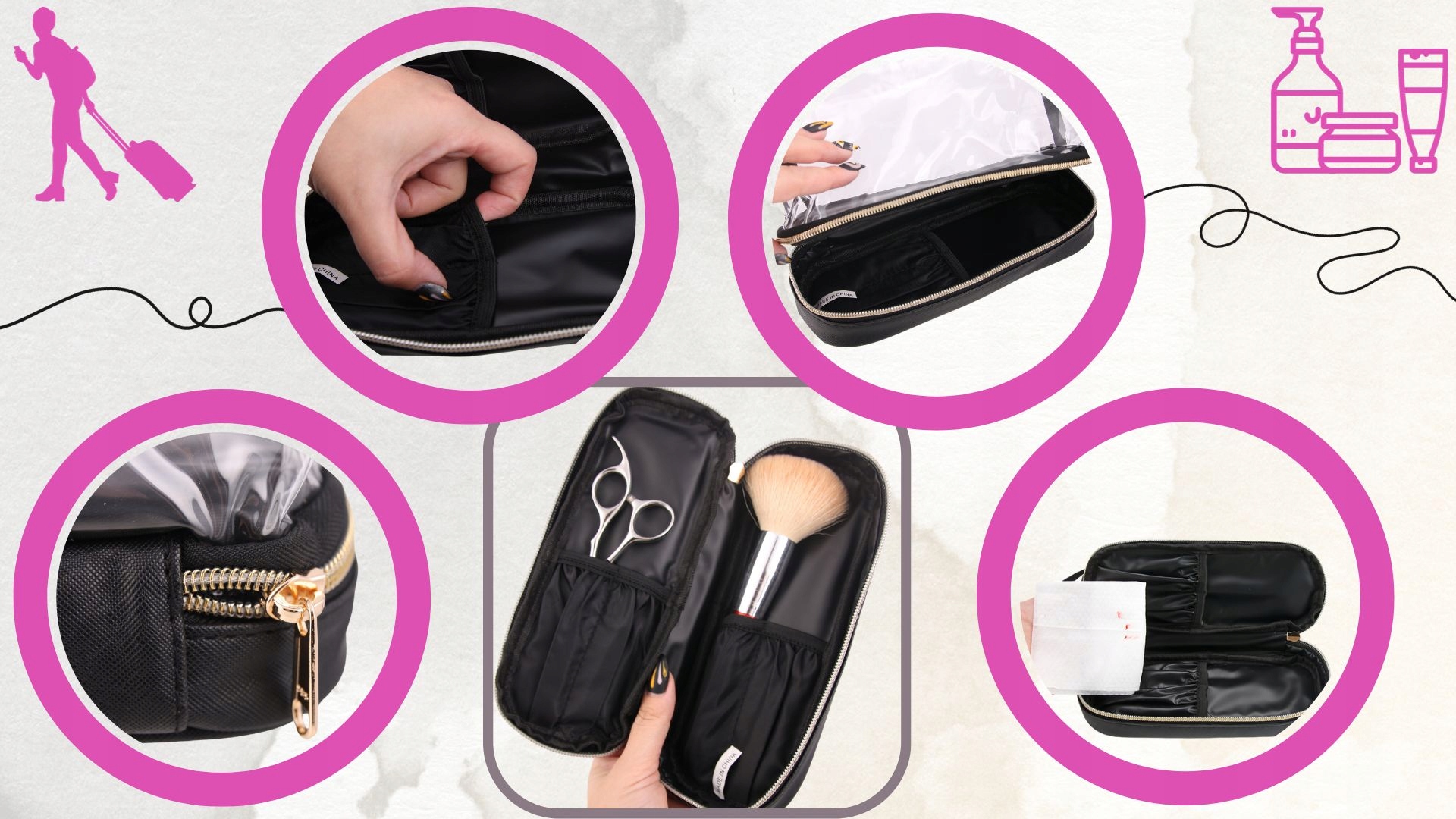 - ✅Двошаровий дизайн - прозорий верхній шар, чорний нижній з кишенями/відділеннями для пензлів або косметики