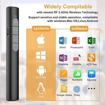 - Широка сумісність: індикатор бездротової презентації підтримує системи: Windows 2003 / XP / Vista / 7/8/10, Mac OS, Linux, Android. програмне забезпечення для віддаленої презентації підтримує таке програмне забезпечення: PowerPoint, Google Slides, iWork (Keynote & Numbers & Pages), Prezi, PDF, MS Word, Excel, ACD See, Website тощо.