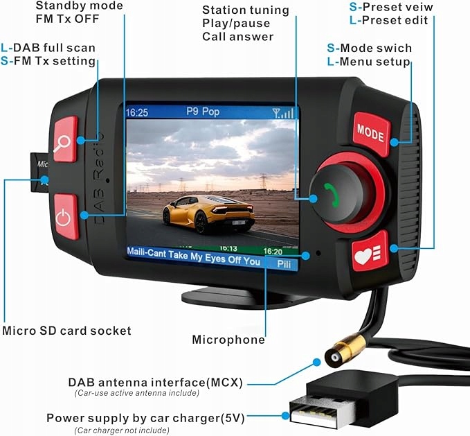 2,4-дюймовий РК-дисплей: Радіо-адаптер DAB для радіо-радіо має 2,4-дюймовий кольоровий РК-дисплей, який показує назву програми, фото, канал та іншу інформацію.