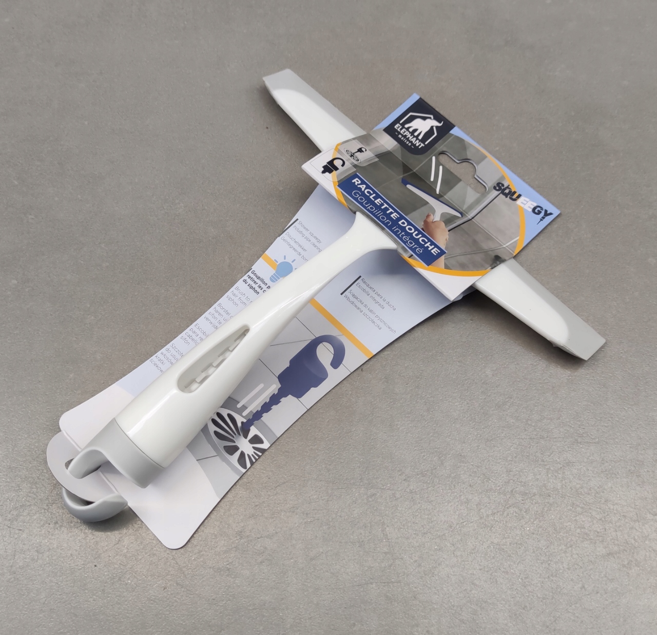 Ракель для душових кабін із гумовою щіткою, розміщеною в ручці для видалення волосся, хутра тощо. Призначено для всіх душових кабін із гнучкими краями під кутом 90 градусів, адаптованими до кутів, спеціально розробленою пластиною ракеля, яка зменшує бризки води. Оснащений вішалкою для підвішування, наприклад, на душовій трубі. Ергономічна ручка забезпечує міцний і надійний хват у руці.