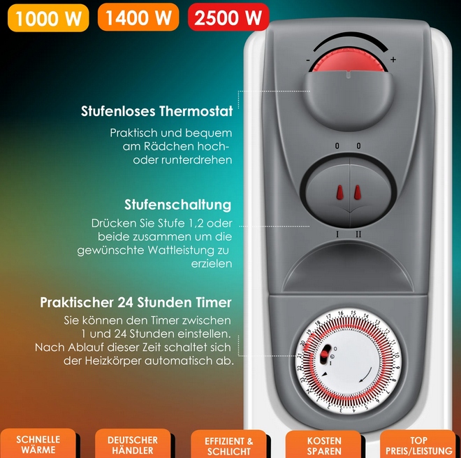 Використовуване нагрівальне середовище - це масло . Він швидко нагрівається, тривалий час зберігає тепло і рівномірно дає його, навіть довго після вимкнення потужності. Ви можете встановити таймер на період від 1 до 24 годин. Після цього часу радіатор автоматично вимикається. Завдяки цьому ви можете зберегти бажану температуру.