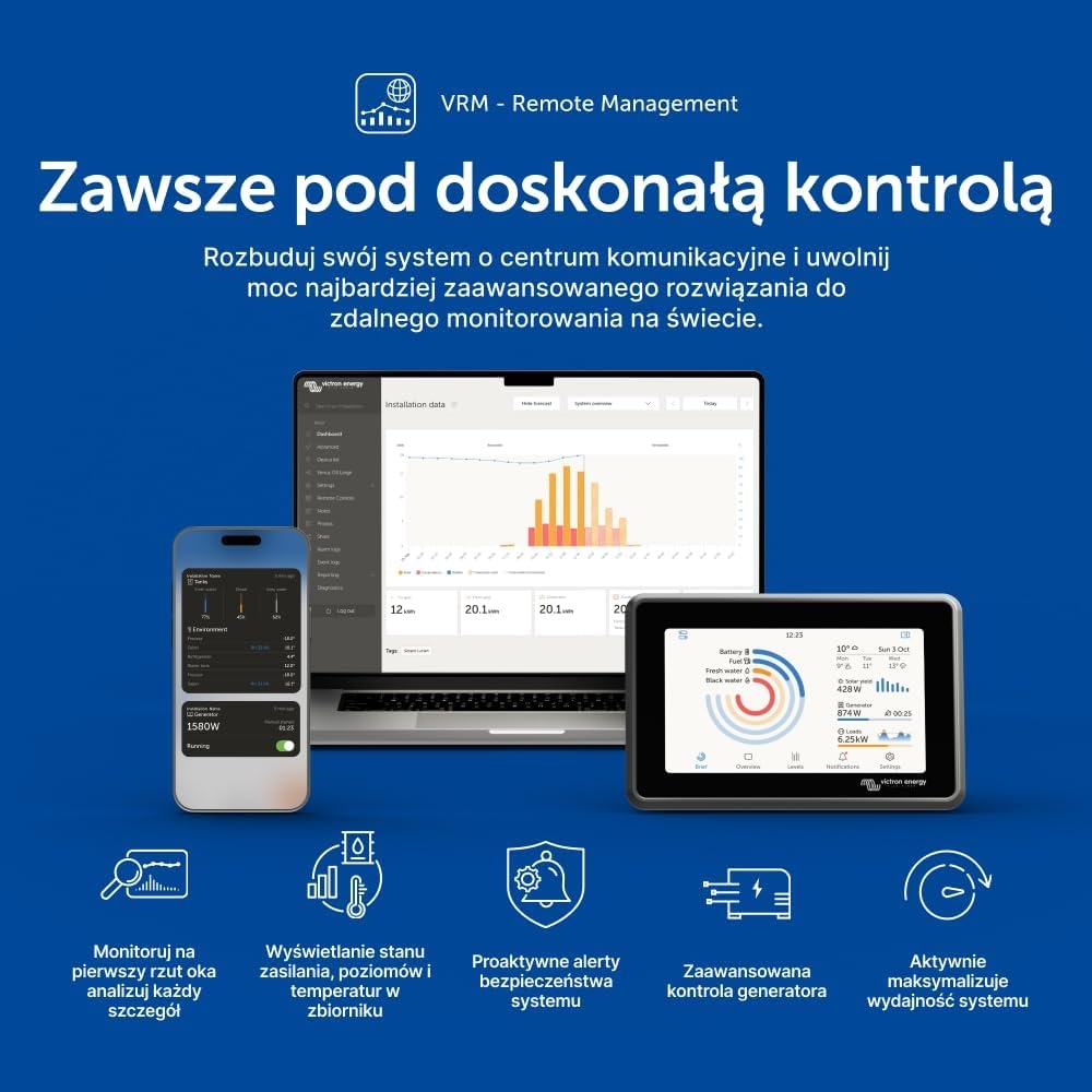 4Підключення: додаток VictronConnect дозволяє підключитися до системи для отримання розуміння даних у режимі реального часу та 30-денної історії продуктивності. Легко налаштуйте пристрої за допомогою налаштувань попередньої розбиття, змінюйте налаштування, оновіть прошивку та встановіть тривоги, щоб адаптувати систему до ваших потреб. Ви також можете підключитися до центру зв'язку за допомогою кабелю VE.Direct (продається окремо) та монітор з будь -якої точки світу за допомогою VRM