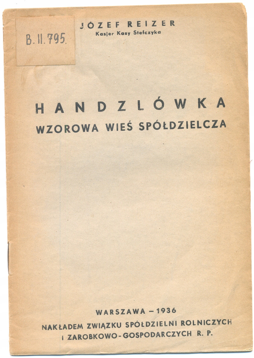 Юзеф Рейзер (касир каси Стефчика) - "Гандзловка - зразкове кооперативне село". Варшава 1936 р. Вид-во Союзу сільськогосподарських і торговельних кооперативів Р. П. 20 стор., іл. Палітурка буклету трохи пошкоджена. В доброму стані. Бібліотечний дублет.