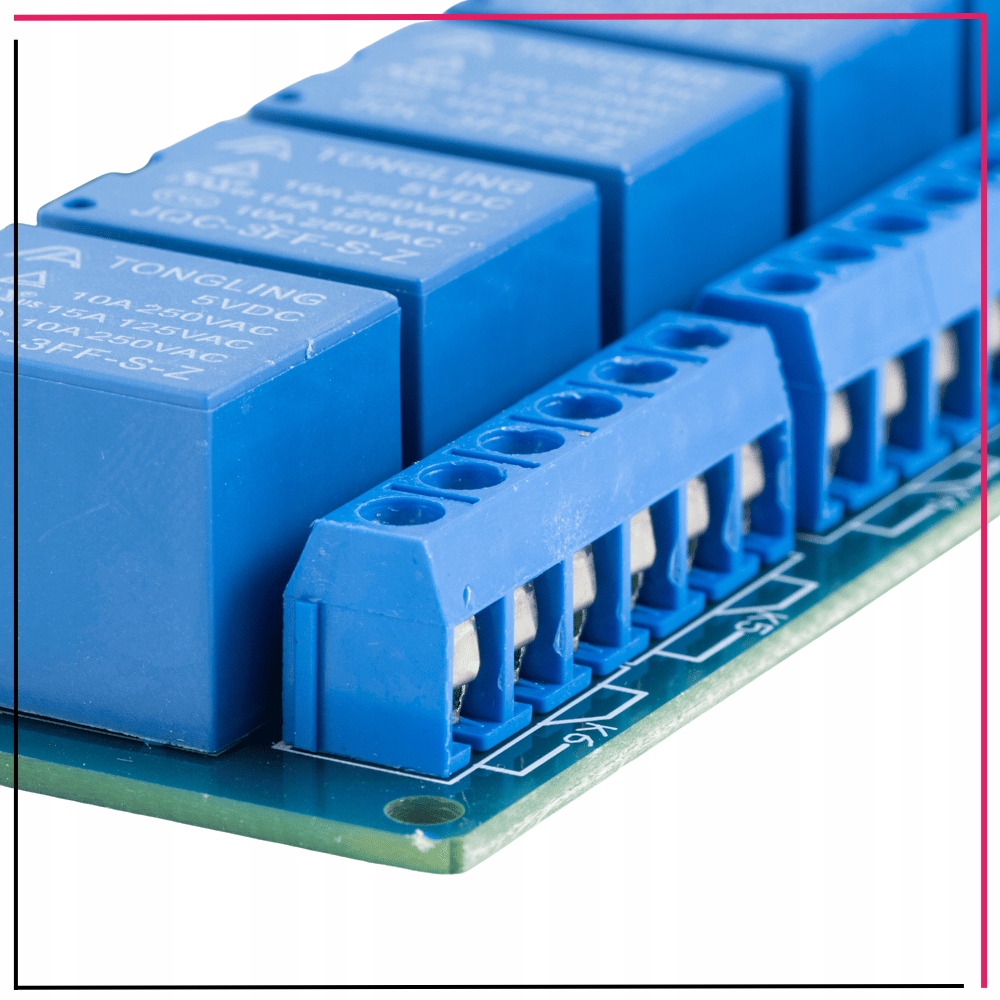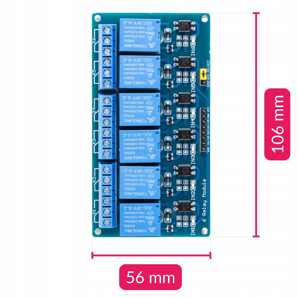 6-канальний модуль реле 5В 10А-це висока якість системи для управління пристроями , що постачається з 230 В змінним струмом. Відокремлює гальванічно керовану систему від мікроконтролера.