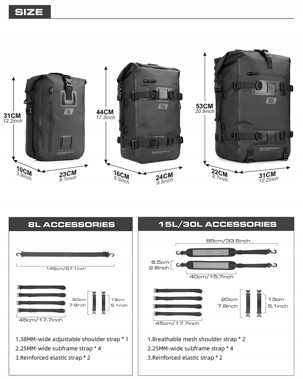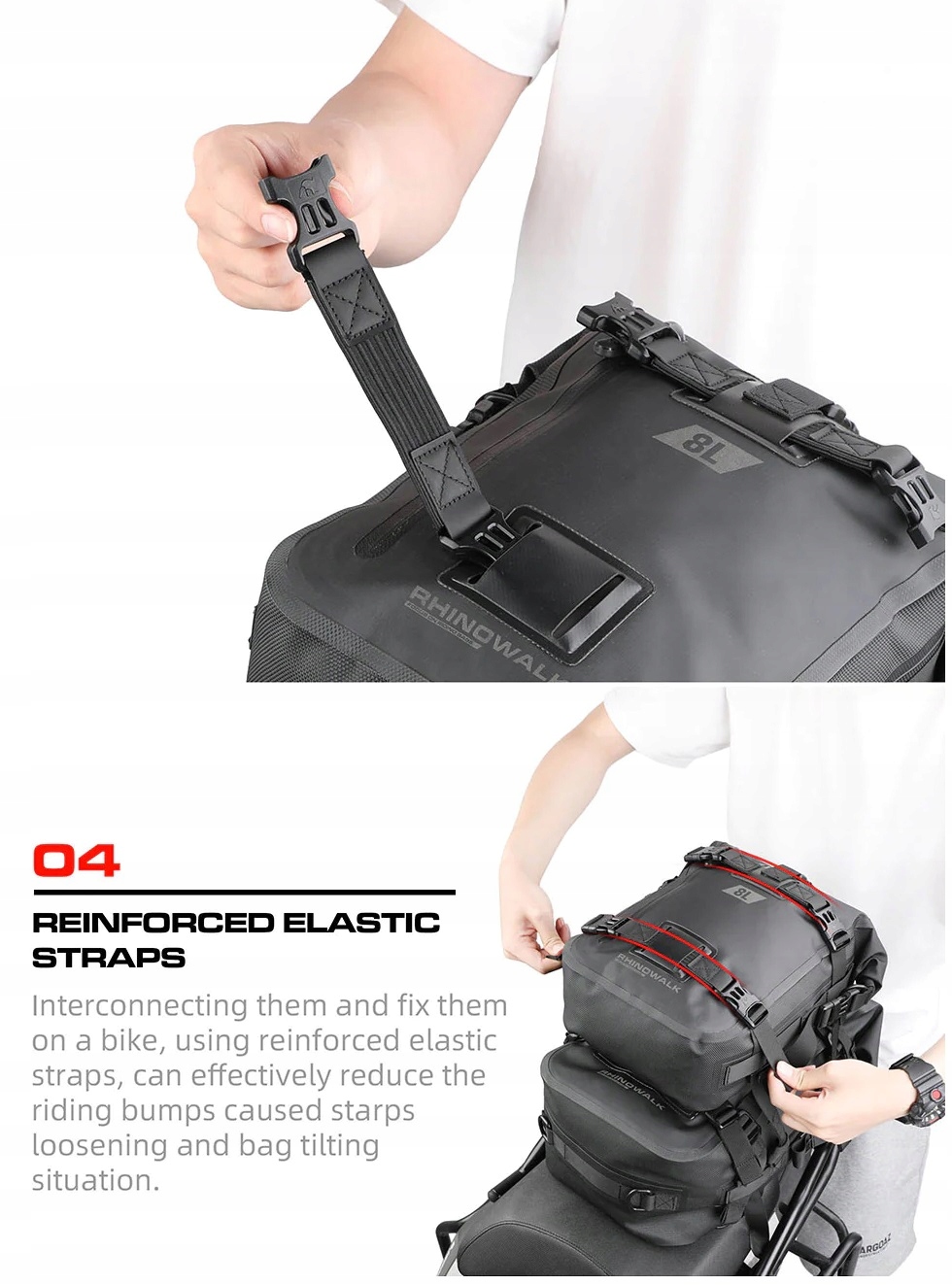 Багато ємності: -використовуйте один за одним або штифти додаткові модульні пакети для створення ідеальної багажної системи потужністю до 68 літрів. 3 розміри: 8L/15L/30L
