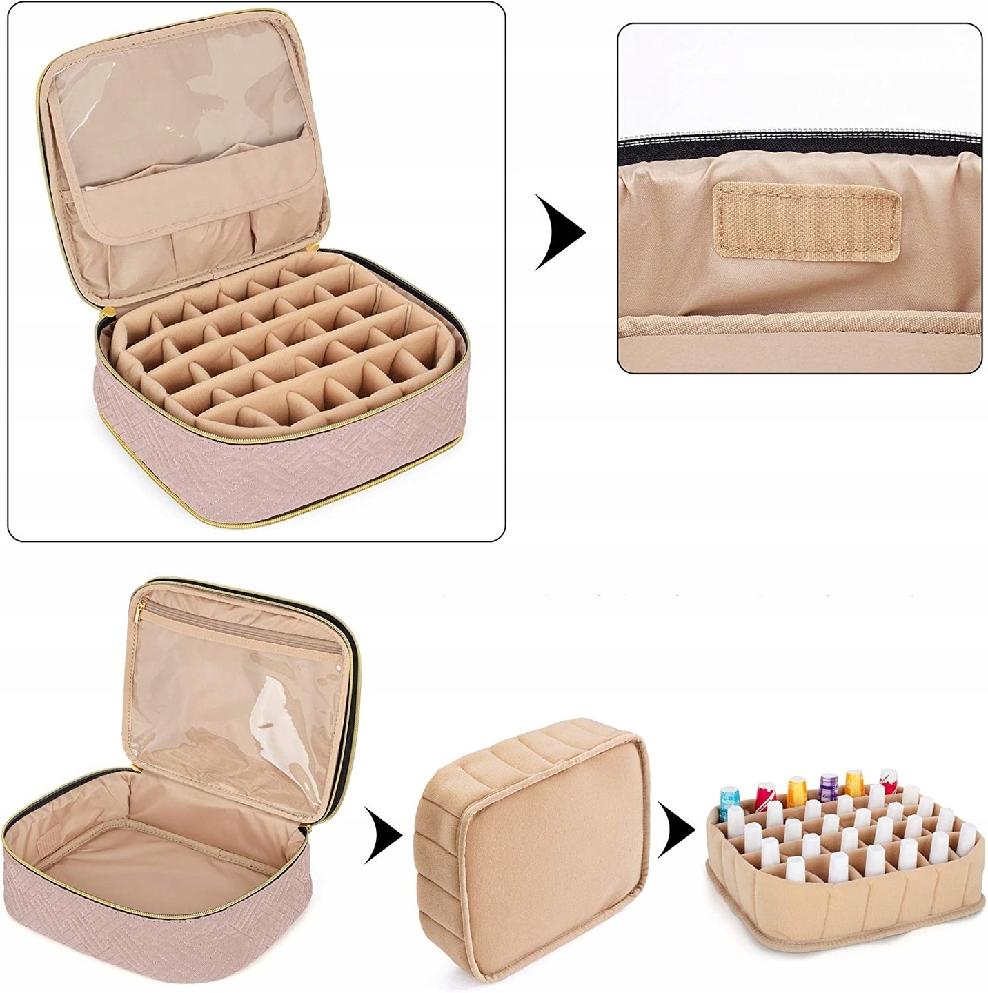 Знімний дизайн: Середня блискавка з'єднує 2 організаторів для лаку для нігтів. Кожен організатор лаку для нігтів (з пляшками) може вмістити до 30 пляшок лаку для нігтів потужністю 15 мл. 4 (Слід пам’ятати, що відсіки вписуються в пляшки нижче 8,2 см.)