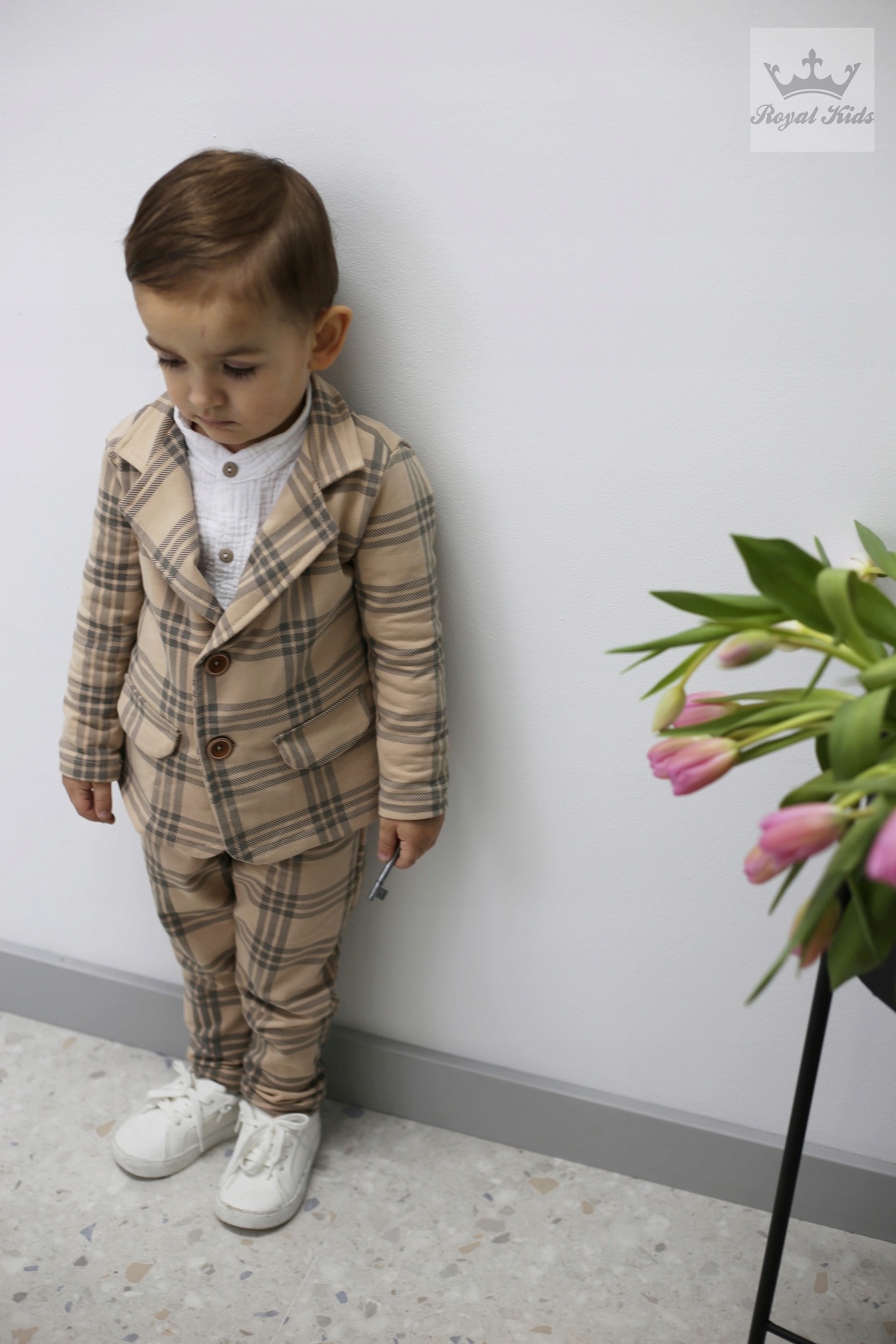 Оригінальний бавовняний костюм для хлопчика - це модна модель, яка поєднує в собі зручний крій і елегантний стиль. Набір виконаний в бежевому кольорі. Все це доповнює широка решітка по всій поверхні. Спереду є імітація кишень. Куртка застібається на два гудзики. Штани з комплекту мають еластичний пояс.