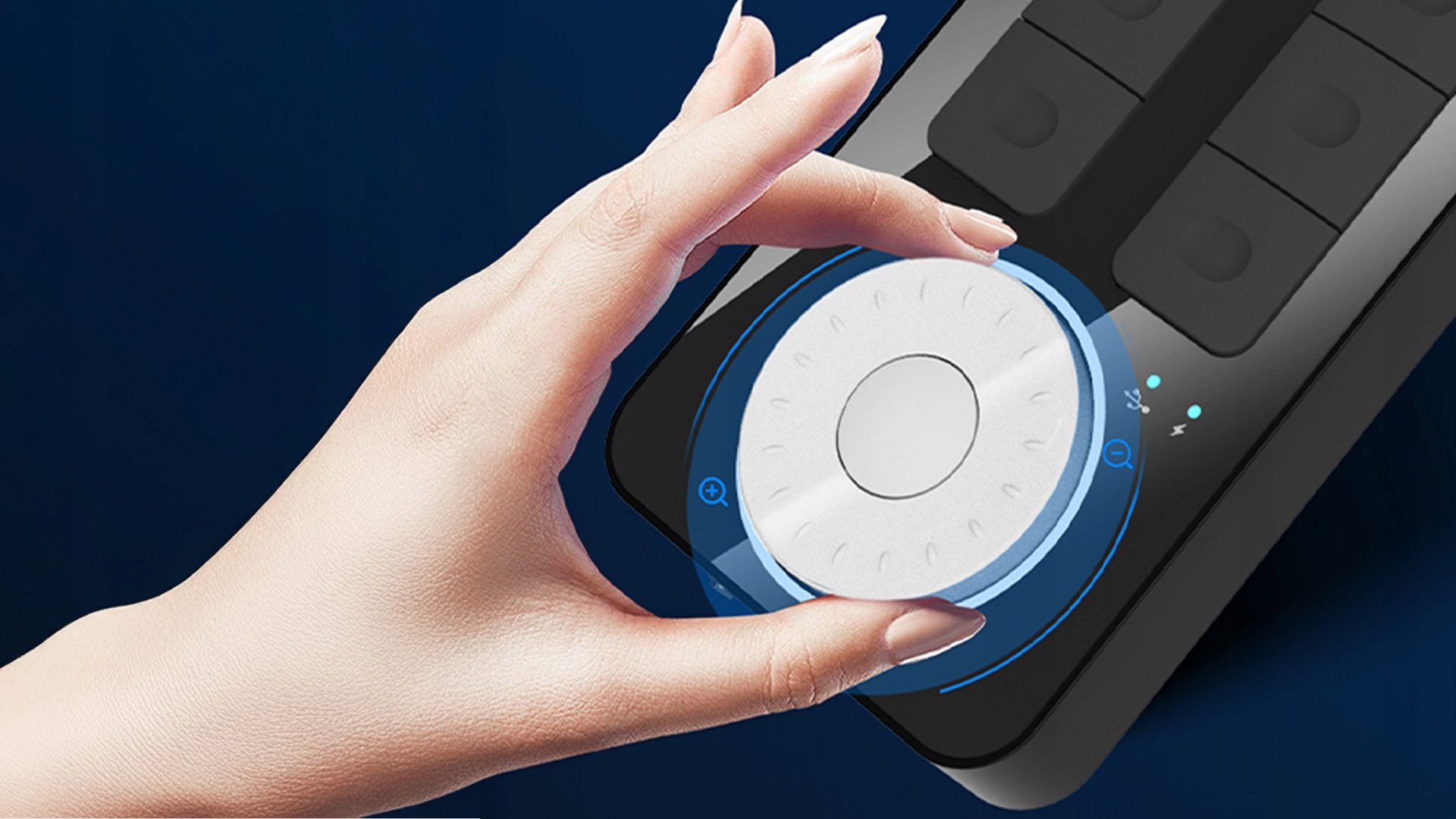 Інтегрована ручка пропонує точний контроль, і кожен з 24 делікатних клацань забезпечує звукове та тактильне підтвердження. Завдяки відповідному опору, щит працює плавно, що робить його ідеальним для таких функцій, як: Zoom , обертання полотна або зміна розміру кисті - забезпечує повне занурення в творчий процес.