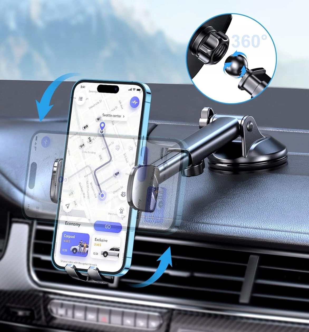 повністю встановлений: Завдяки тисячам випробувань та вдосконалень, власник автомобіля пропонує обертову кулю на 360 ° та основну присосну чашку та механічну руку, яку можна регулювати в межах від 12,6 см до 16,9 см. Це дозволяє встановити ручку під бажаним кутом, щоб забезпечити необмежену лінію зору та безпечне водіння.
