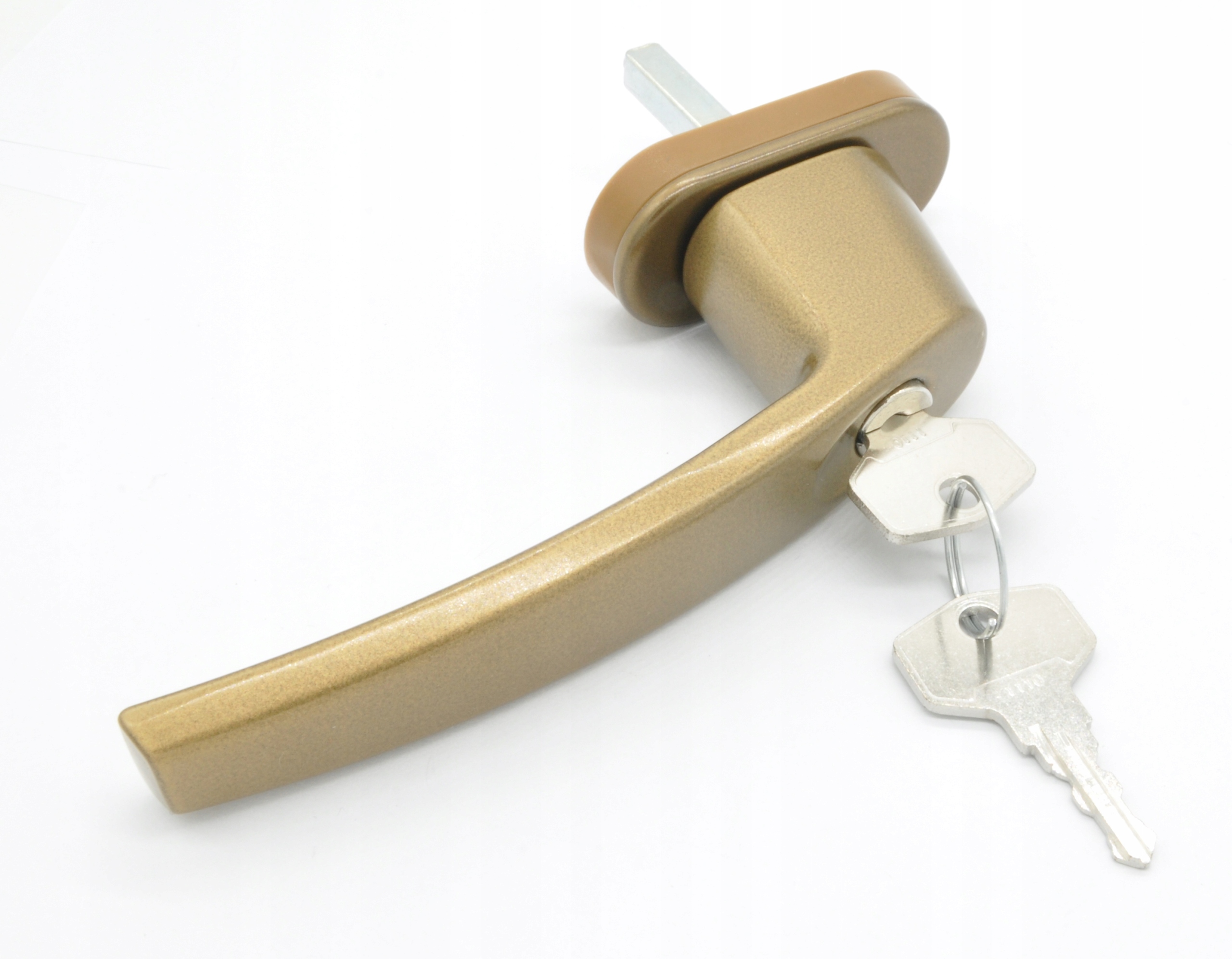 Опис: ручка виготовлена з алюмінію, пофарбованого золотом/патиною (основа для закручування виготовлена з пластику). Ручка оснащена замком, який дозволяє зафіксувати віконну ручку в закритому або відкинутому положенні. Замок захищає вікно від сторонніх осіб ззовні, навіть після розбиття скла, а також додатково захищає від дітей, які можуть відкрити вікно, особливо у високих будівлях. Монтаж передбачає відкручування старої ручки (2 гвинти, закриті ковпачком) і прикручування нової ручки замість старої. Ручка прикручується двома гвинтами 5,0 x 40 мм.