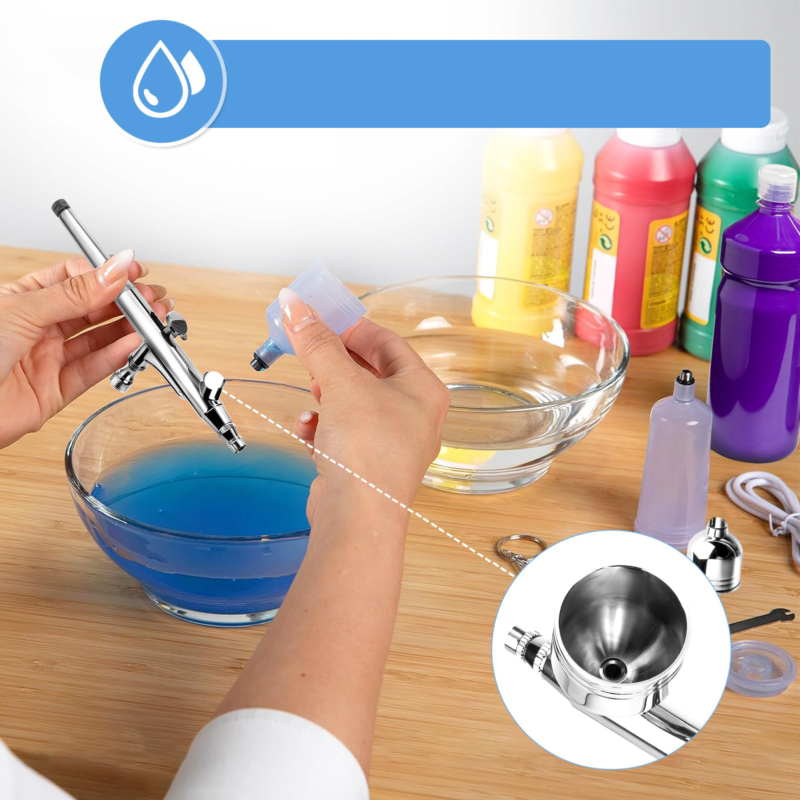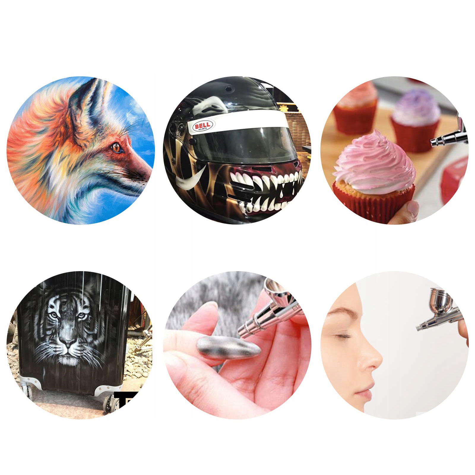Цей набір аерографів має широкий спектр застосувань, його можна використовувати для прикраси, малювання, розпилення архітектурних предметів, кольорових пігментів та пігментів для татуювань, догляду за нігтями, фарбуванням тіла тощо. Це чудовий інструмент для ентузіастів Diy.