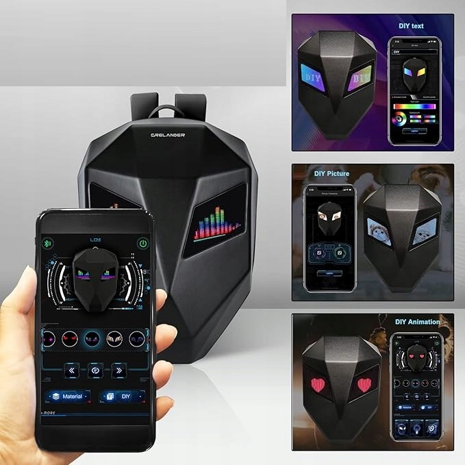 Матеріал: Інтелектуальний рюкзак з світлодіодним лицарем з водонепроникним 3D -хардкорним матеріалом; Широка назад, 1680pvc Dot Matrix Eraning з роздільною здатністю 48 x 48 кольорів; З регульованим ремінцем плечей, петлею грудної клітки та затискачою; Дихаючий матеріал на спині.