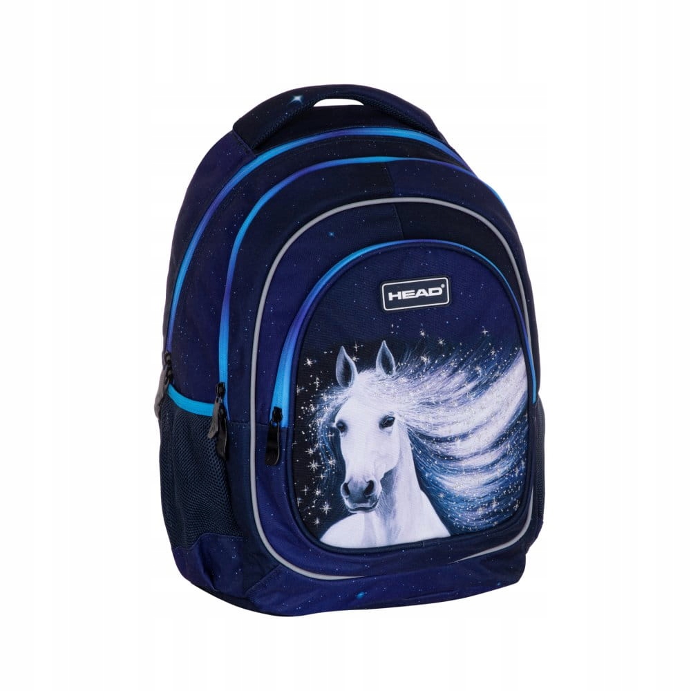 Рюкзак Head Galaxy із трьома відділеннями — абсолютний хіт цього сезону. Елегантні темно-сині кольори, графіка білого коня з казковою гривою і пасмами в пастельних тонах омбре підкорять серце кожної дівчини. Рюкзак оснащений трьома місткими відділеннями, повними практичних відділень. Використовується унікальна технологія Ergo Back, яка мінімізує тиск на плечі та хребет і забезпечує комфорт дитини.
