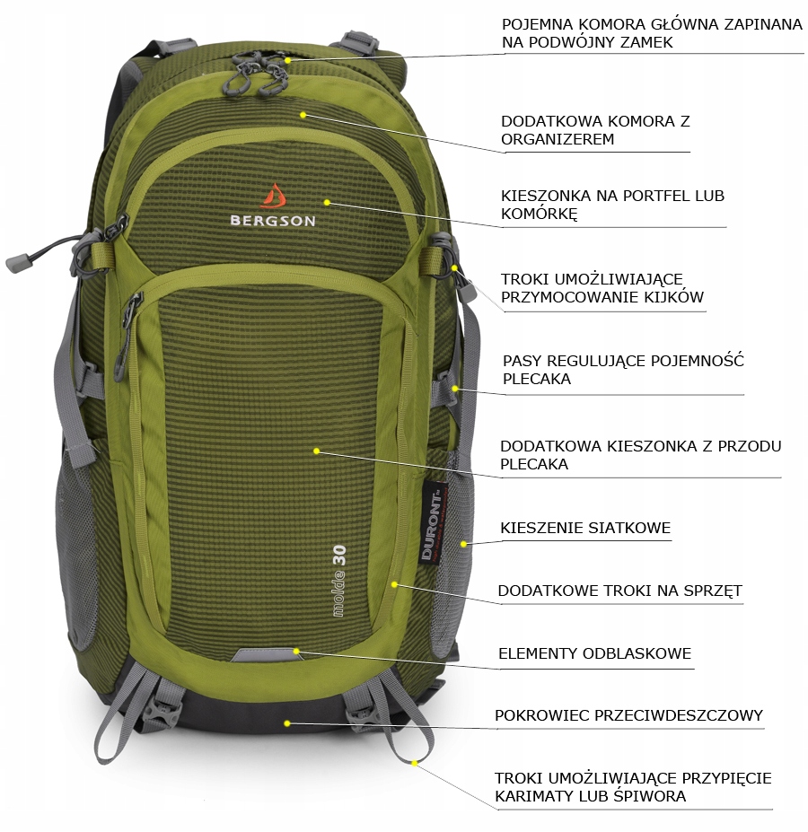 Комфортний, дуже місткий рюкзак від BERGSON з інноваційною структурою системи перенесення. Модель Molde відмінно підійде як під час поїздок в гори, так і в якості міського або навіть шкільного рюкзака. Має зручний стегновий ремінь і нагрудний ремінь, який стабілізує рюкзак на плечах за допомогою рятувального свистка, вбудованого в пряжку. Завдяки додатковій кишені всередині рюкзака та спеціальному отвору, він був адаптований для кріплення міхура для води (пропозицію відповідних пляшок для води можна знайти на інших наших аукціонах). Рюкзак також має можливість кріплення палиць або льодоруба. Завдяки системі перенесення AIR IN-VENT SQ-MESH® з плечовими лямками анатомічної форми «S» рюкзак дуже добре носиться, зручний і ви не будете відчувати втоми навіть після тривалого походу. Дуже міцно виготовлений і добре оброблений - кожна деталь вишукана. Виготовлений з матеріалів найвищої якості: Honeycomb Rip-Stop Duront® - дуже міцна, але легка тканина з стільниковою структурою, додатково посилена додаванням додаткового, більш міцного волокна. Завдяки використанню сітки AIR-MESH на плечових лямках і подушках несучої системи рюкзак забезпечує вільну циркуляцію повітря. Рюкзак характеризується високою стійкістю і дозволяє комфортно використовувати навіть у складних умовах з великими навантаженнями.