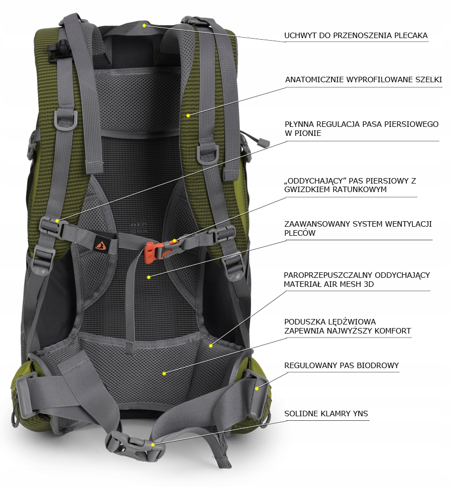 Рюкзак має повітропроникну систему для перенесення на основі металевого каркаса, загнутого всередину, і сітки, натягнутої на спині. Також є зручні подушки, обшиті сіткою AIR-MESH внизу та зверху спинки. Система перенесення з поясом на стегнах знімається. Тоді ми отримаємо меншу вагу рюкзака, більшу місткість і можливість згорнути рюкзак. Розміри рюкзака без стегнового ременя та системи перенесення також відповідають розмірам ручної поклажі: