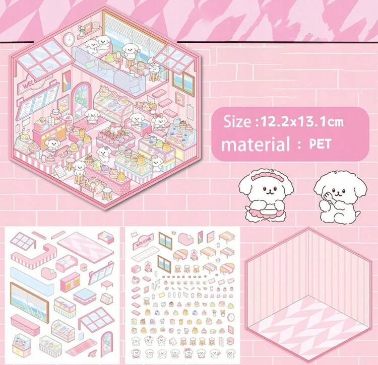 Почніть розваги з 3D -наклейок. Кожна одиночна упаковка складається з однієї картонної кімнати (шестистороння форма), плюс один великий аркуш наклейок з елементами обладнання, тобто меблів, килимів, полиць та іншого великого аркуша з персонажами - це прекрасні солодкі тварини.