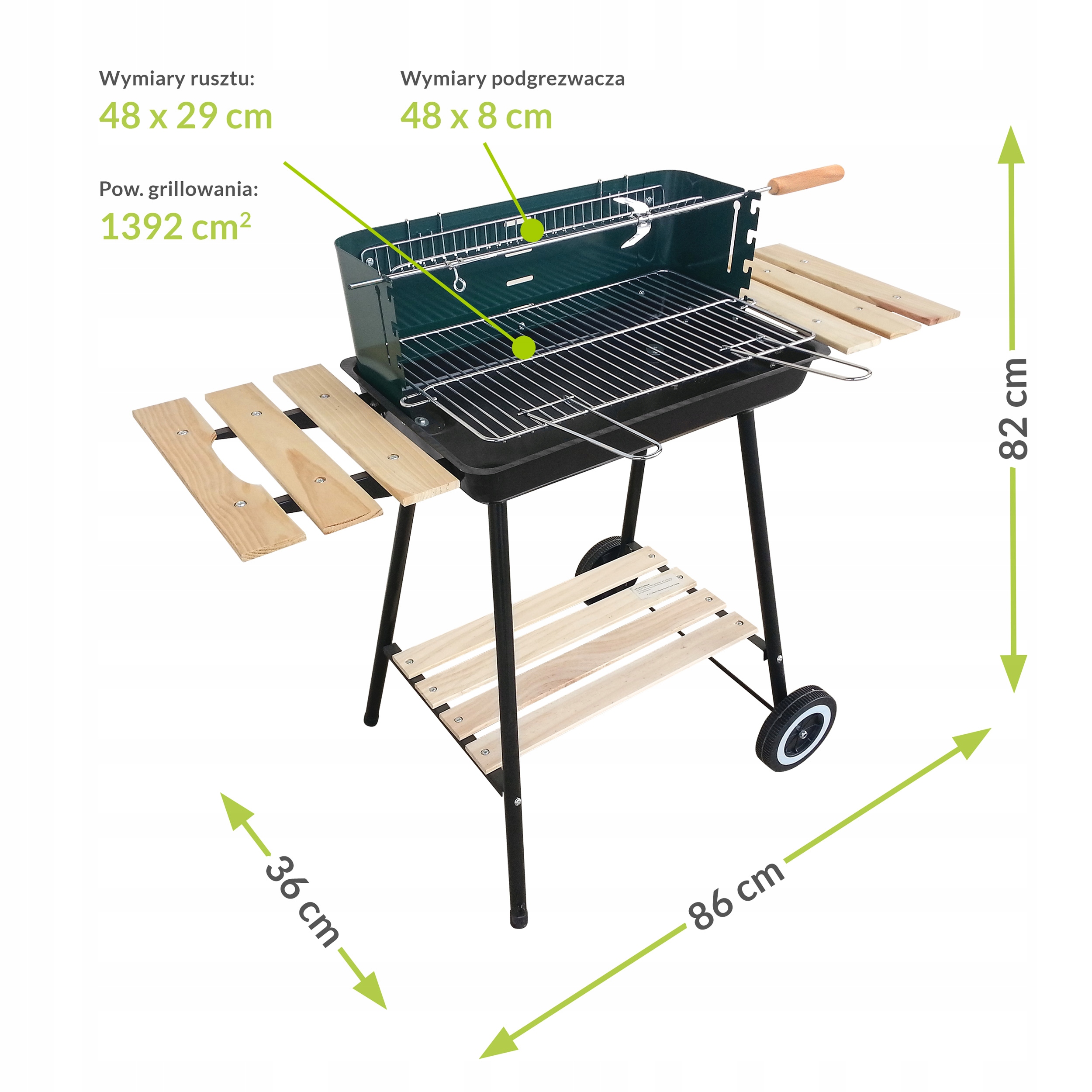 - Обладнання:Хромований нагрівач, вертел для курки, дерев'яна ручка, 2 дерев'яні бічні полиці, нижня полиця, транспортувальні колеса