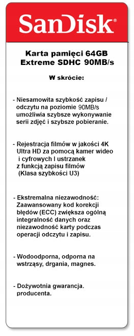 Картка пам'яті одного з найбільших виробників флеш -пам'яті, що характеризується високою та високою параметрами запису та читання. Карти працюють з пристроями, оснащеними портом SD. Вони всебічні. Їх можна використовувати в камерах SD та HD, камерах, а також багатьох інших пристроях.