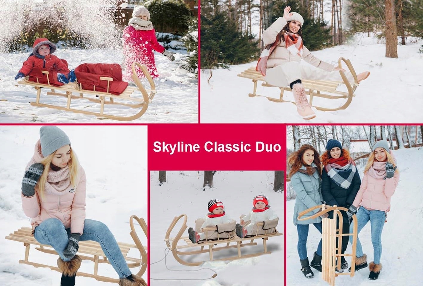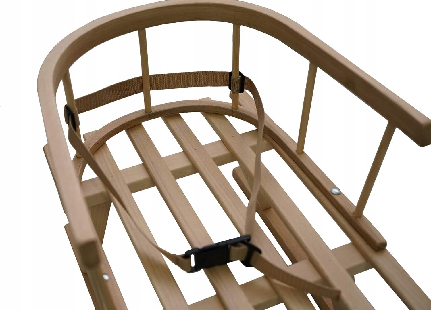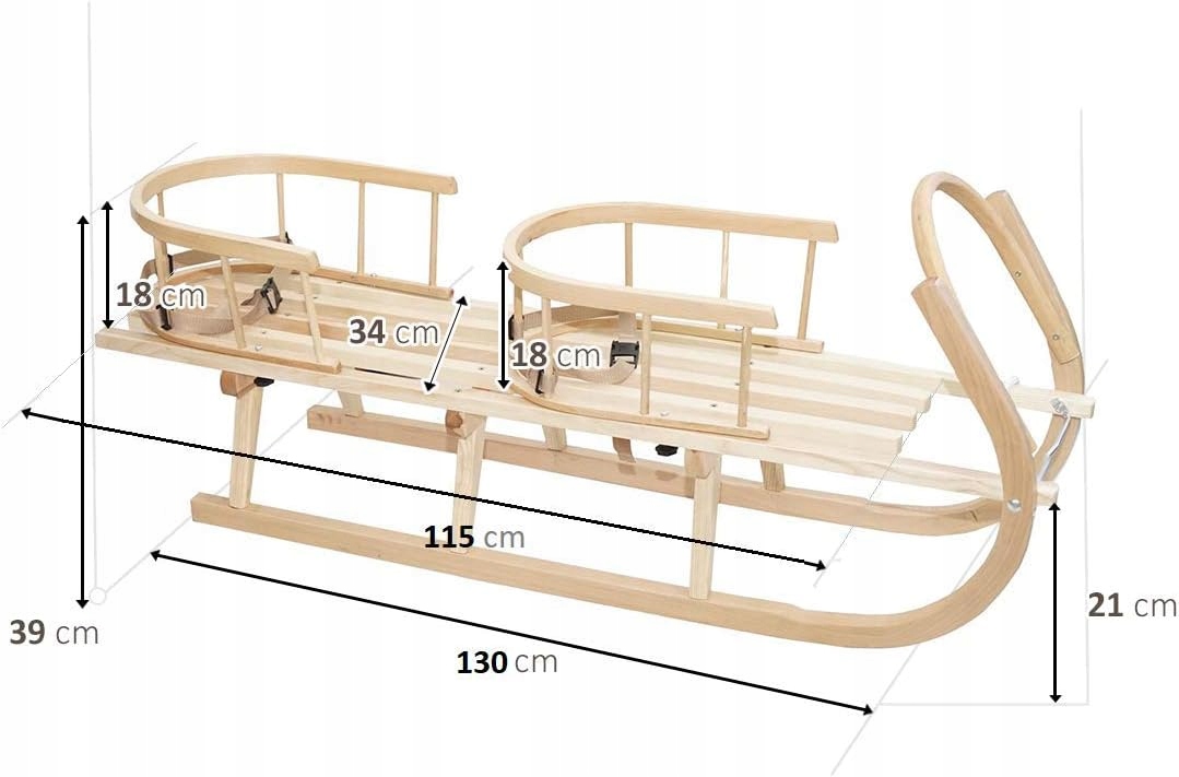 - Дерев'яні сани з букового дерева, покриті натуральним лаком, з металевими полозами з двома спинками та тяговою мотузкою. / Ідеально підходить для дітей і дорослих як санки для спуску.