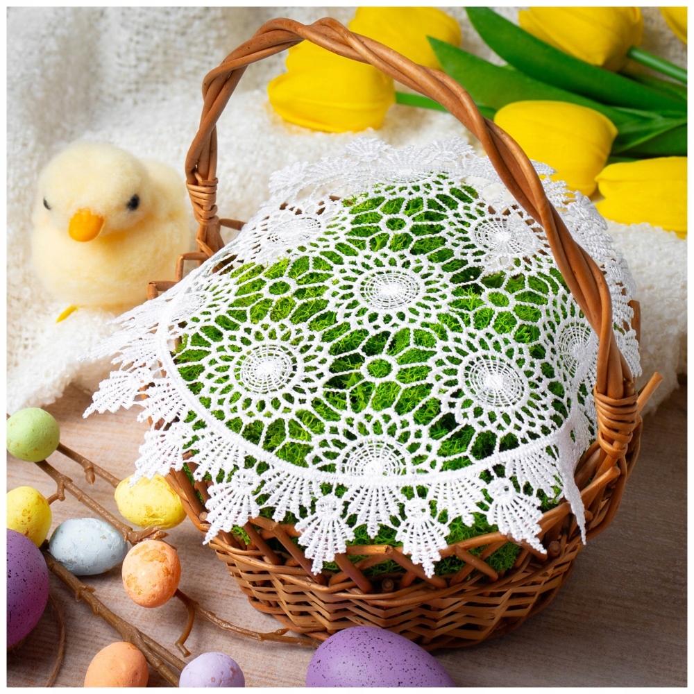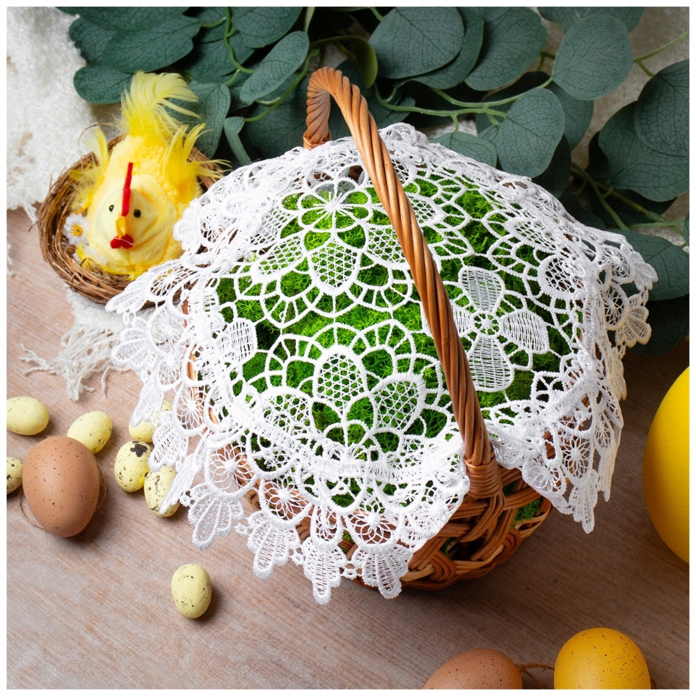 Кошик, прикраси та вся композиція, видно на знімках, служать лише для ілюстративних цілей і не є частиною пропозиції. Ми продаємо лише прекрасну білу серветку, ідеальну для прикраси великоднього кошика.