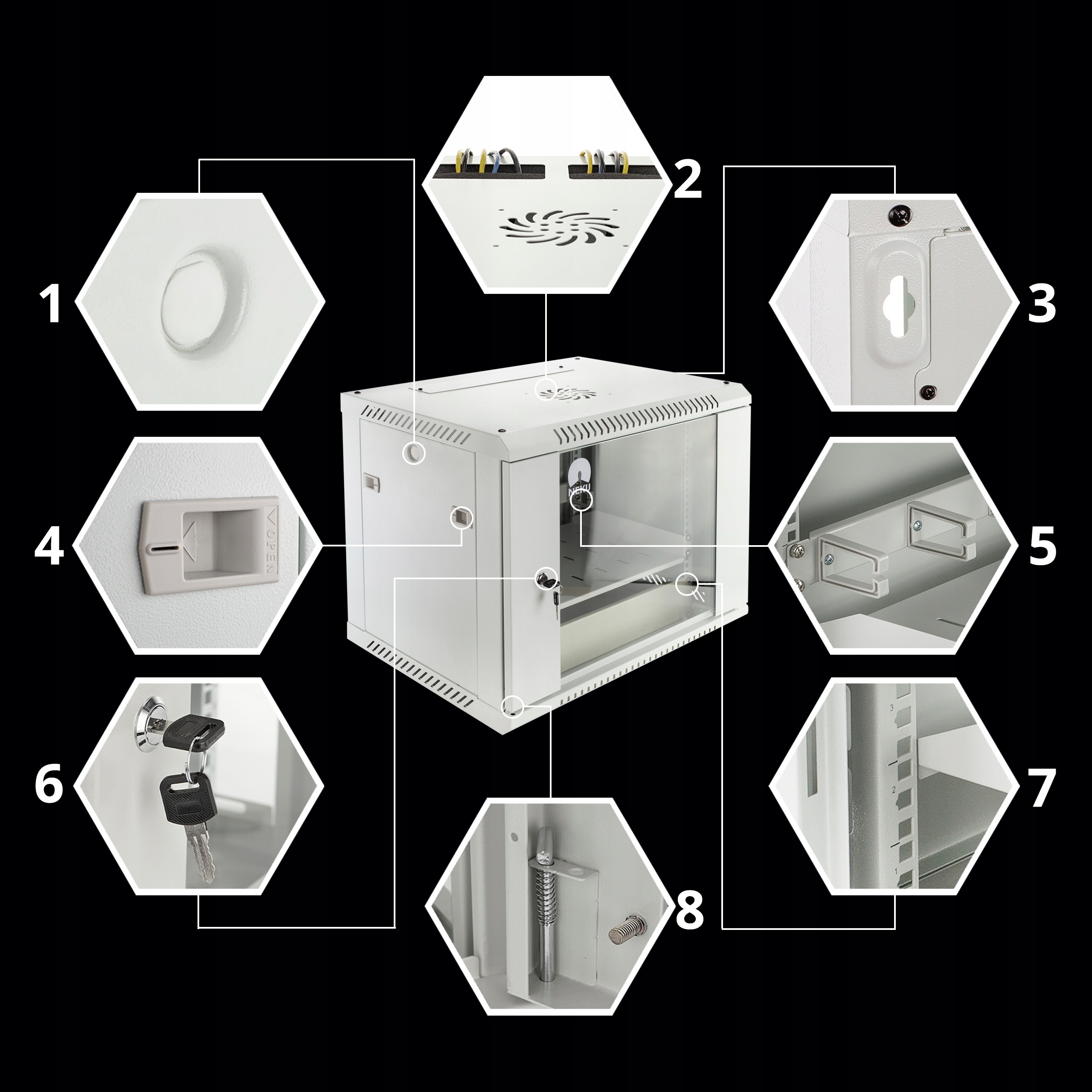 підвісні шафи -стійки 19 "від Neku Увімкнути правильне розташування активних та пасивних пристроїв та завдяки ефективній розробленій пасивній вентиляції забезпечити оптимальні умови праці для встановлених пристроїв: охолодження, захист від забруднення та захисту від доступу несанкціонованих осіб. Необхідні та настільні пристрої, такі як: мультисвіти, реєстратори, підсилювачі або живлення. Для складання цих пристроїв використовуються полиці стійки . в сірих та 4U, 6U, 9U, 12U, 15U та 18U з глибиною 450 мм і 600 мм у чорному