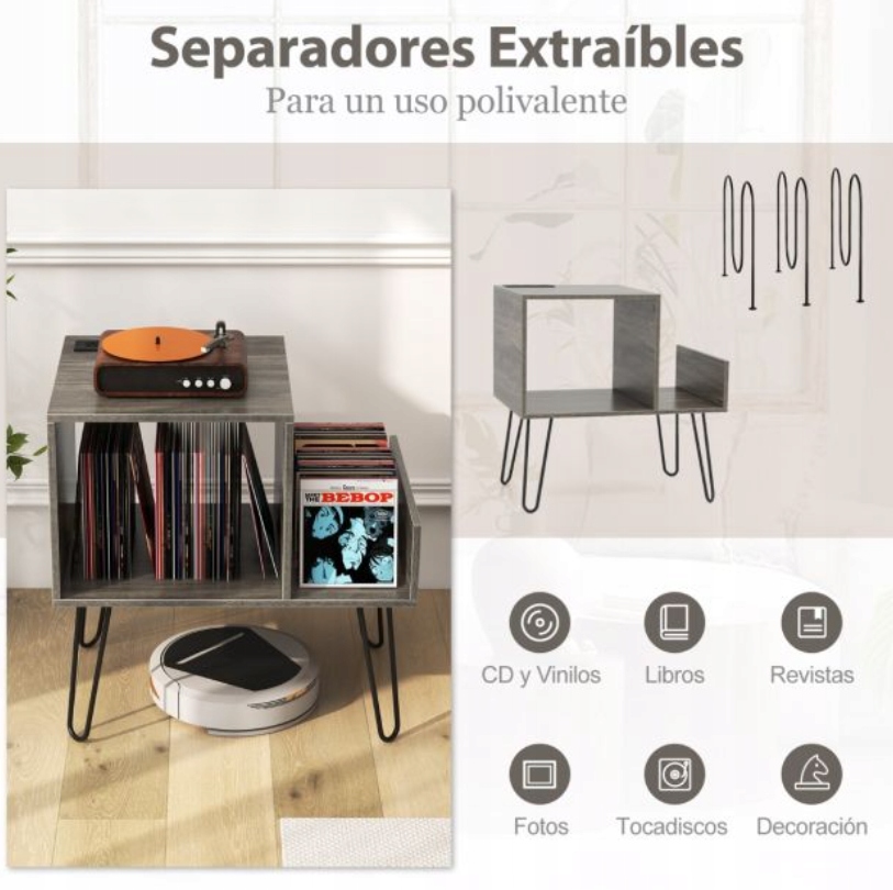 - Вініловий зберігання високої ємності: Стійка вертушки має відкриту камеру зі знімними перегородками, яка дозволяє адаптувати простір до колекції вінілу чи інших носія. Бічна полиця ідеально підходить для відображення улюблених тарілок або декоративних предметів.