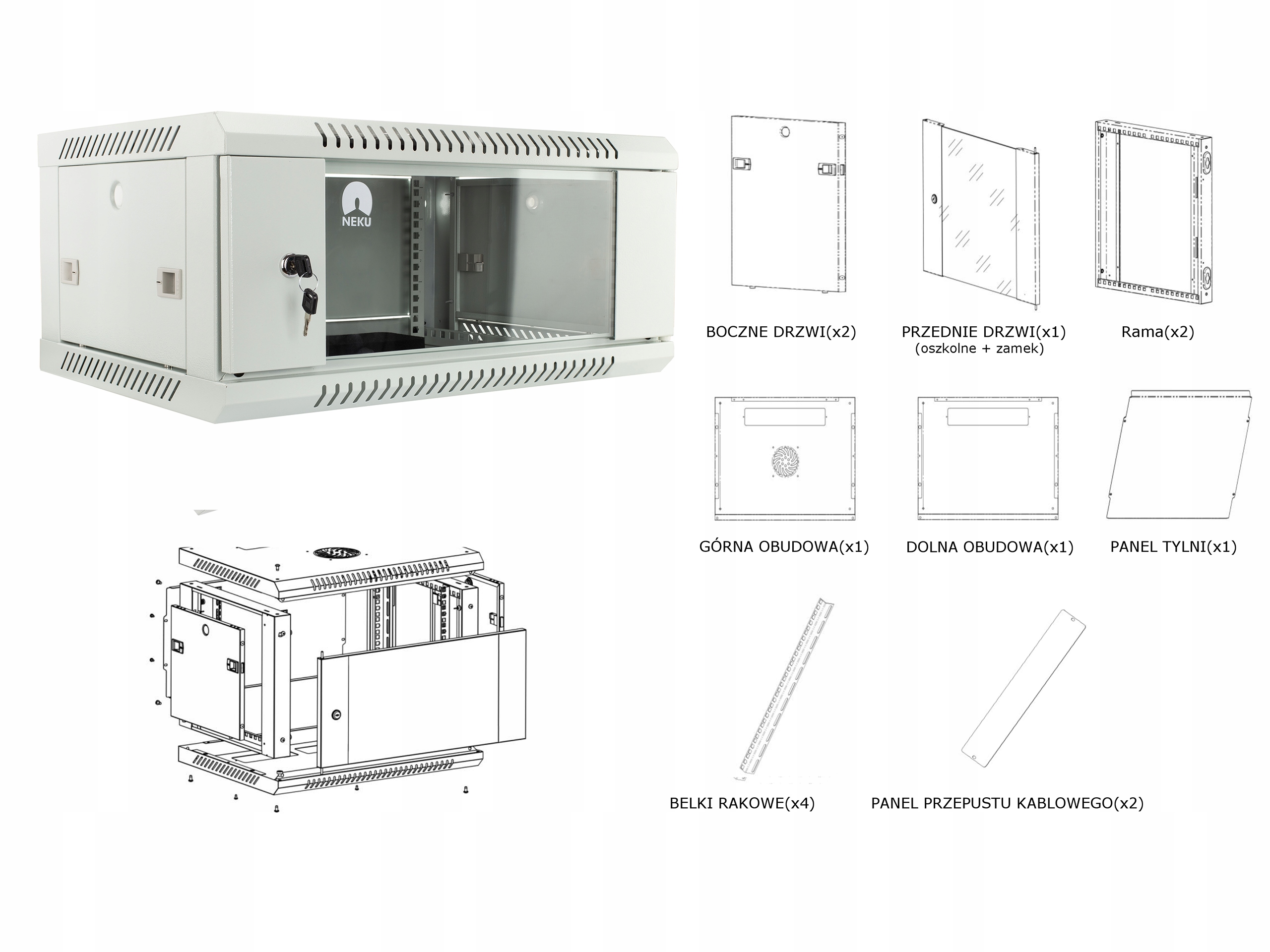 Підвісні стелажні шафи NEKU 19" дозволяють правильно розташувати активні та пасивні пристрої та, завдяки ефективно розробленій пасивній вентиляції, забезпечити оптимальні умови роботидля встановлених пристроїв: охолодження, захист від забруднення та захист від несанкціонованого доступу.