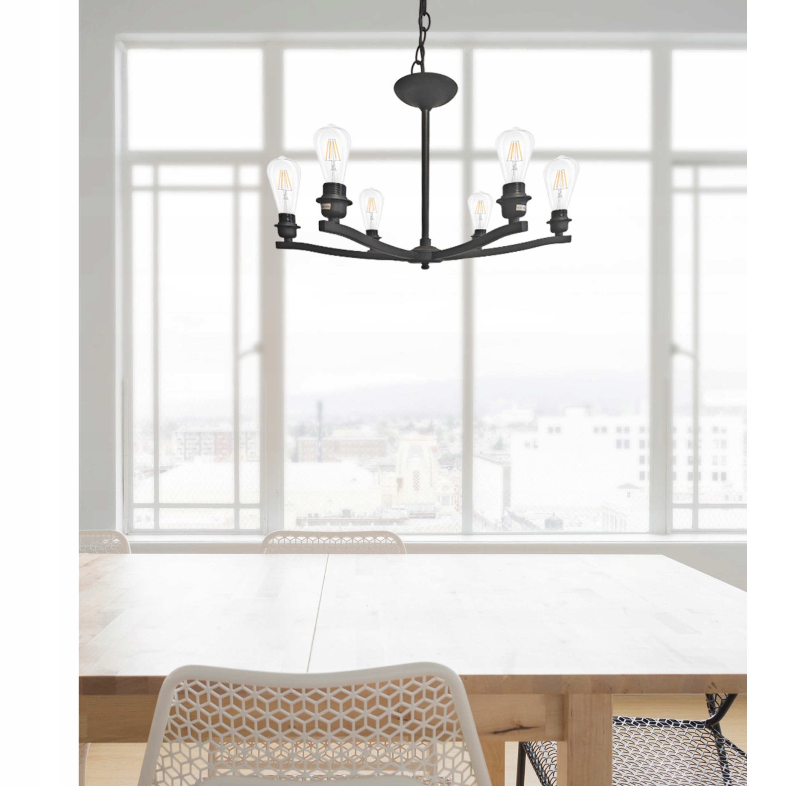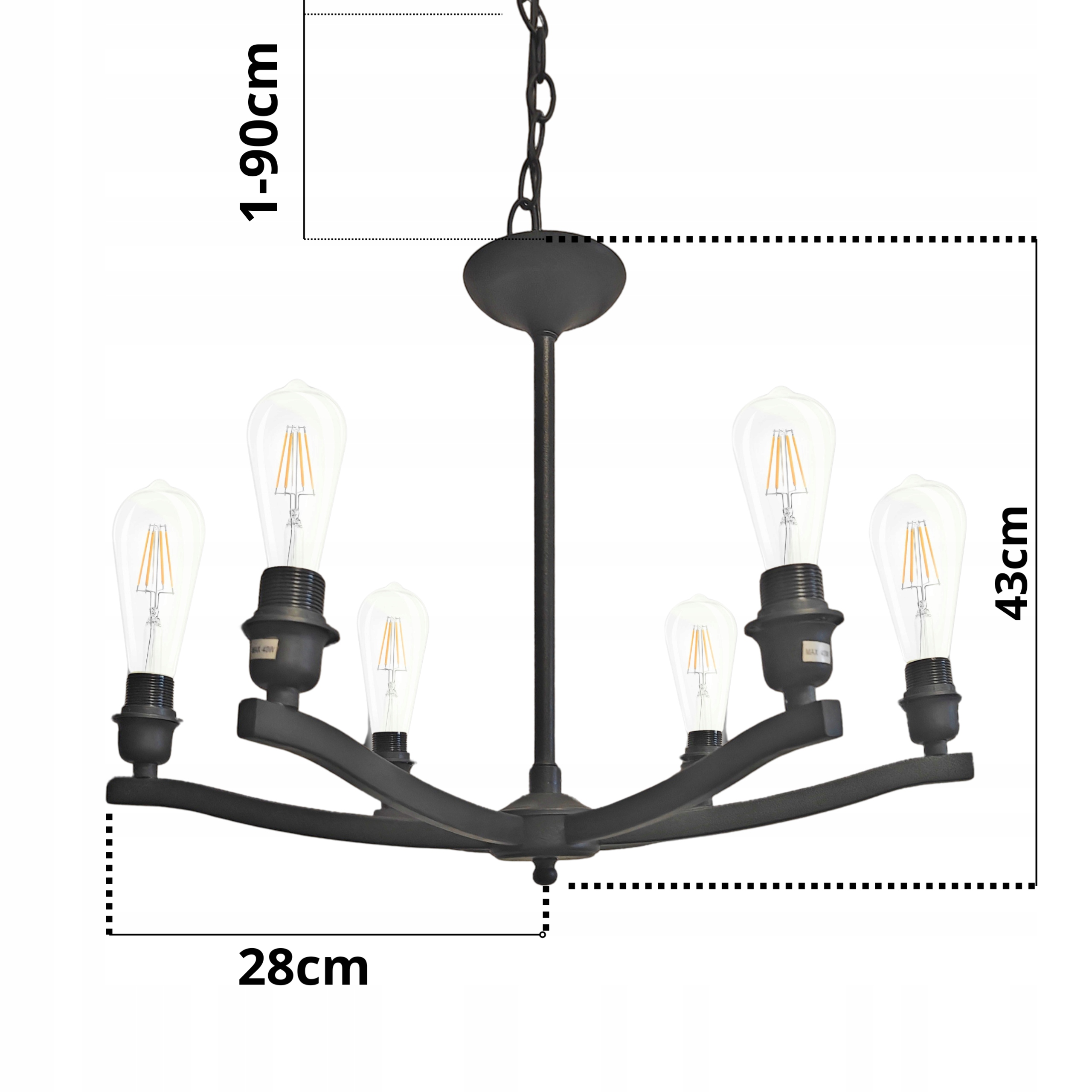 елегантна, сучасна люстра з сирим, промисловим персонажем. Виготовлений з металу в чорній матовій обробці, поєднує мінімалістичну конструкцію з функціональністю. Шість симетрично розміщених рук із відкритими кадрами декоративні лампочки, створюючи унікальний світлий ефект.