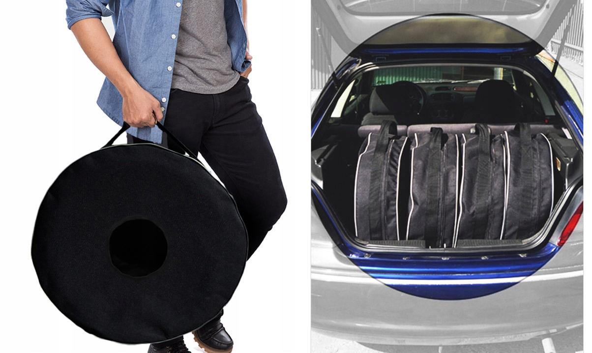 Нижче наведено чохли на шини/цілі колеса у версії «EXTRA», виготовлені з міцного водонепроникного матеріалу з ПВХ покриттям (переплетення 600 x 600) називається кодура. Чохли розроблені та виготовлені компанією LASOTA, підігнані під розмір шин, вказаний замовником. Для виготовлення чохлів використовувалися матеріали найвищої якості, такі як: шкіряні нитки, блискавка-петля 1 см, шкіряний ремінь, ремінь (з гнучкою ручкою) навколо чохла товщиною 40 мм, з можливістю навантаження. кілька сотень кілограмів, тому ви можете безпечно перевозити не лише предмети в чохлах, а й шини на дисках. Чохли нашої компанії полегшують перенесення, транспортування та естетично зберігають шини та цілі колеса протягом багатьох років. Крім того, кожен чохол має кишеню з вишитим маркуванням шин, а також отвір діаметром 15 см, призначений для людей, які зберігають колеса на спеціальних підставках або вішалках.