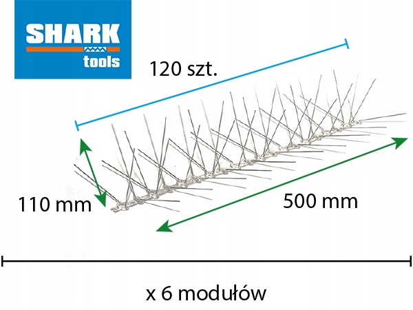 Кожні інструменти акули шипний сегмент завдовжки 50 см оснащені 120 сталевими шипами, Що створює Ефективний захисний бар'єр проти птахів. шипи 110 мм та діаметр 1,3 мм забезпечують ефективне відновлення птахів, такі як голуби або горобці, що запобігає посадці на захищені поверхні.