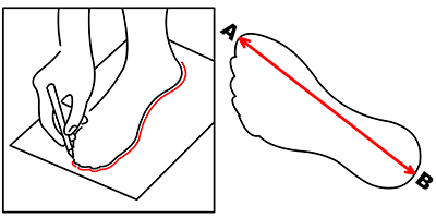 Намічаємо, вимірюємо довжину в см між точками «А» і «Б», додаємо 0,5 см і шукаємо відповідний розмір устілки.