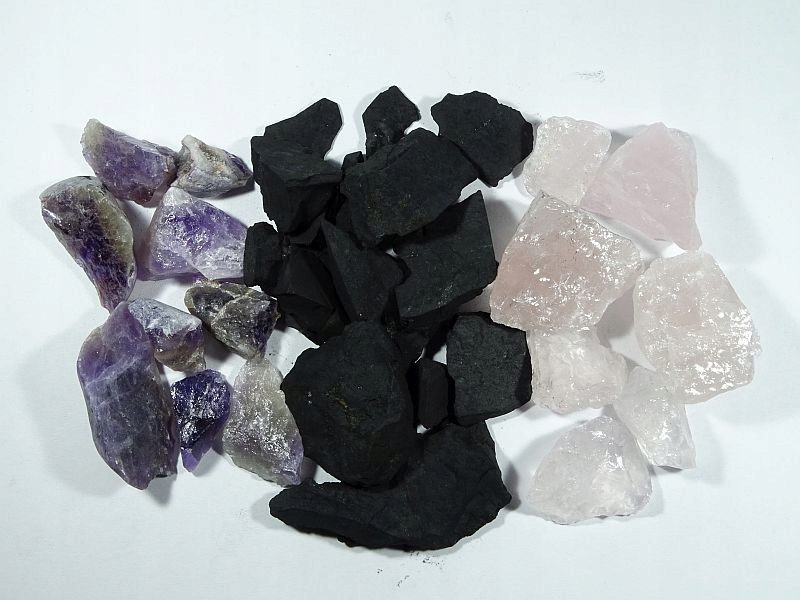 Набір із необробленого аметисту, шунгіту та рожевого кварцу, призначений для енергетики води.