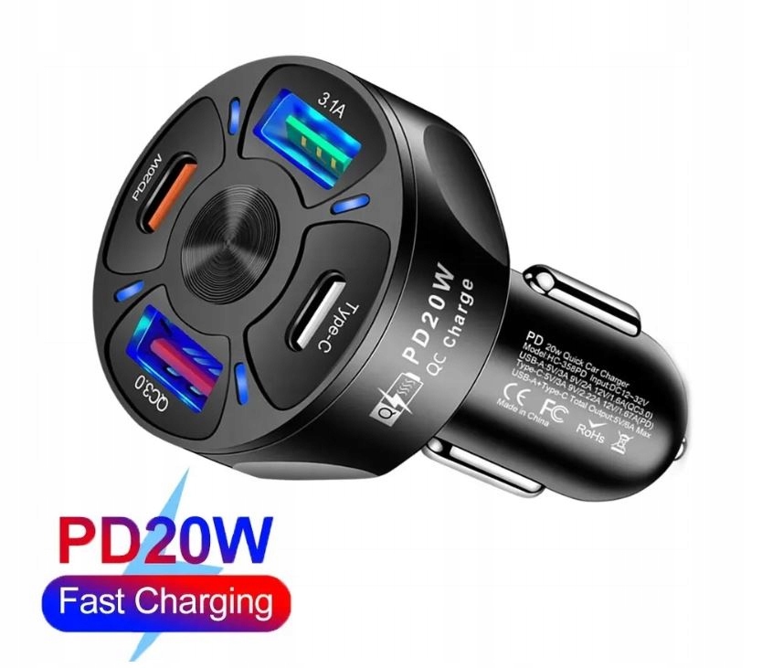 Заряджайте швидше, безпечніше та зручніше — за допомогою потужного автомобільного зарядного пристрою 4x USB QC 3.0 PD.