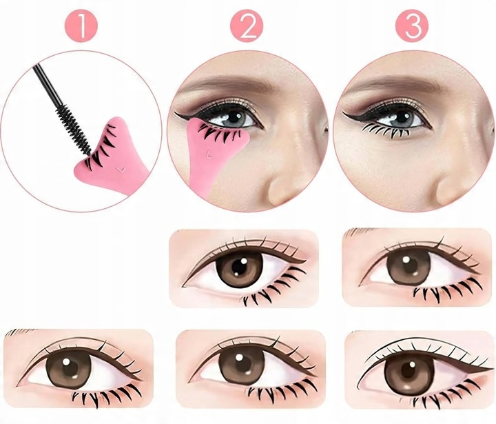 - Захист від бруду під час фарбування вій: розміщення шаблону під лінією вій або на верхній повіці запобігає відскакуванню туші на шкірі, що захищає від бруду під час нанесення туші .