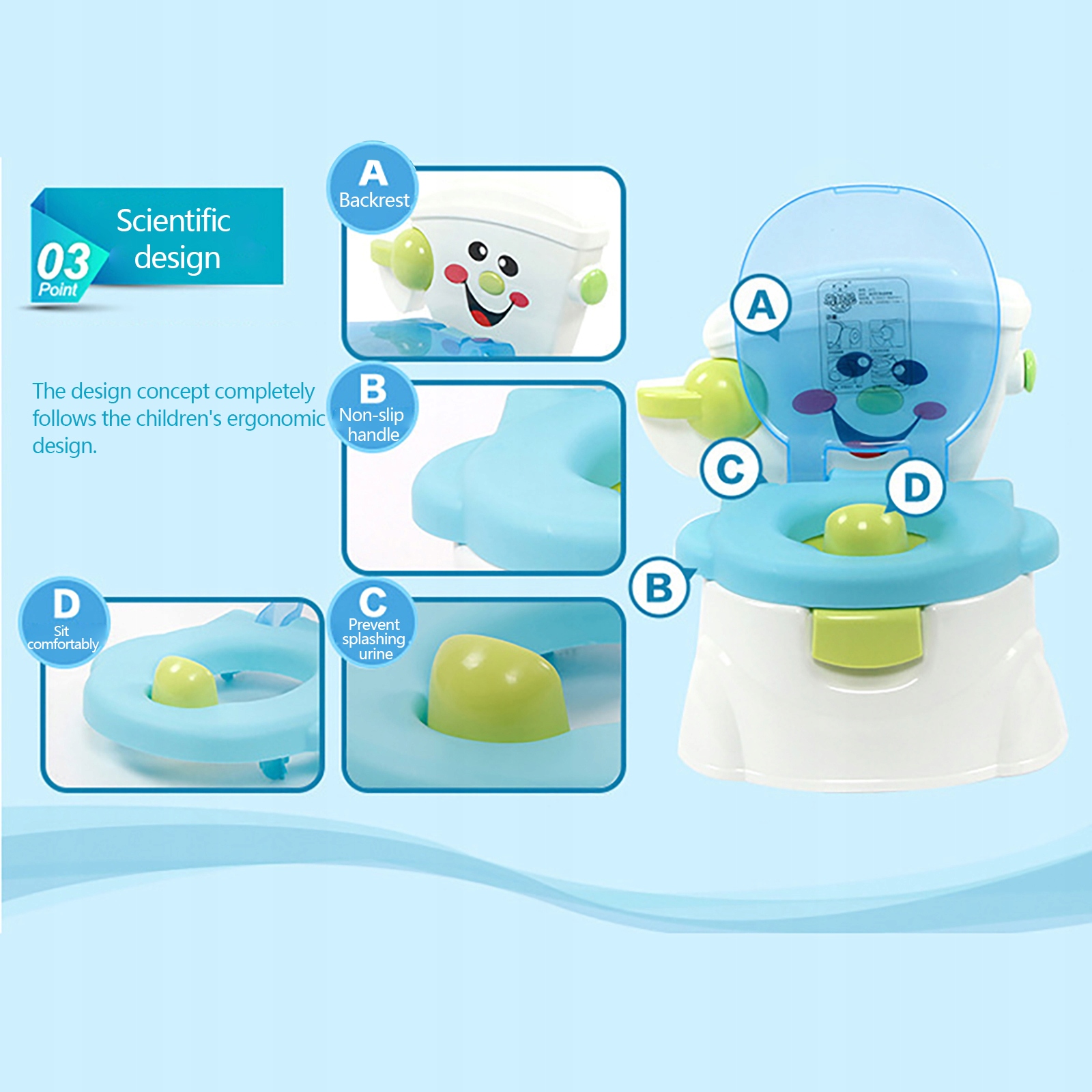 Цей портативний туалет для дітей - це чудова допомога в допомозі дітям розвивати незалежність та гігієнічні звички. Його чарівний блакитний колір та чарівна форма, як іграшка, привертають увагу дітей і перетворюються на туалет у задоволення. Він ідеально адаптується до тіла дитини, завдяки якому він є безпечним, і зручним для використання. Це дійсно чудова можливість для дітей навчитися навичкам самодогляду! Таким чином батьки також можуть звільнитися від клопітної допоміжної роботи та насолоджуватися більшою радістю дорослішання з дітьми.