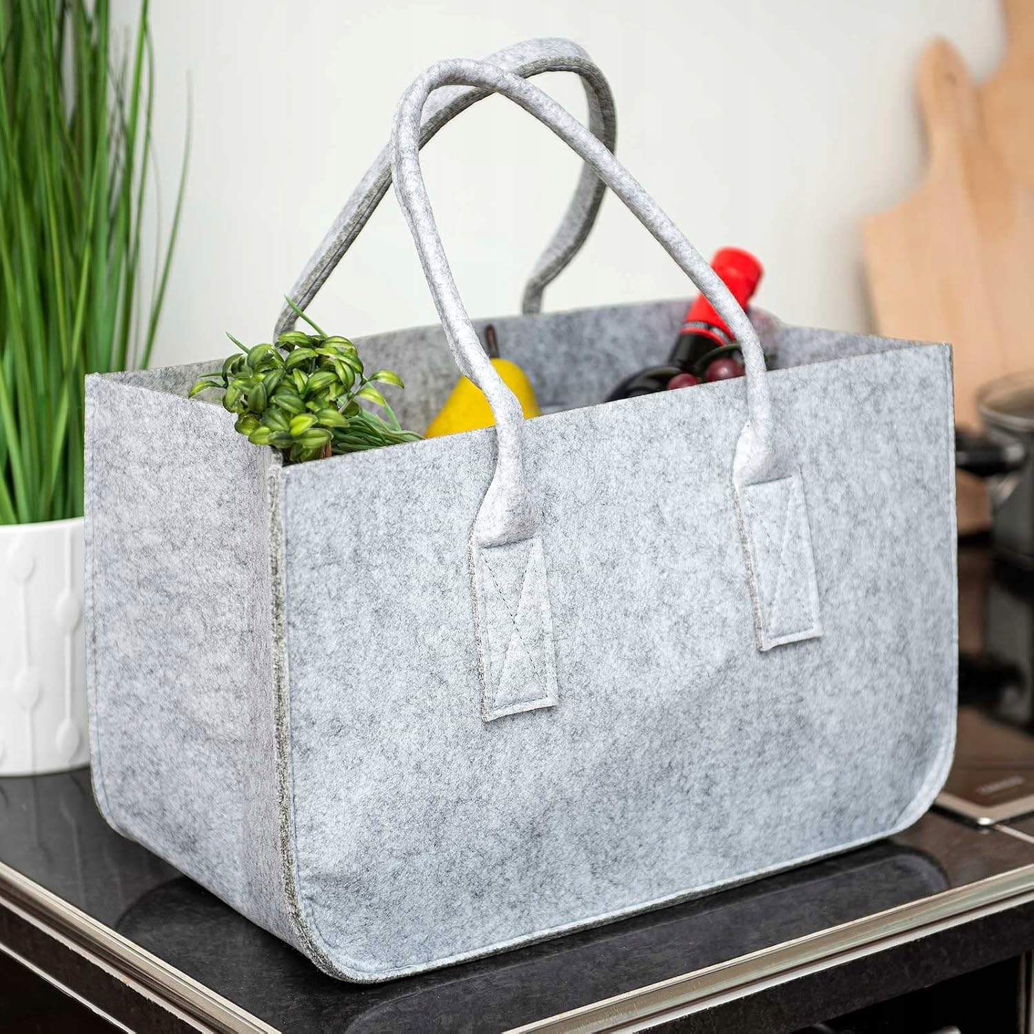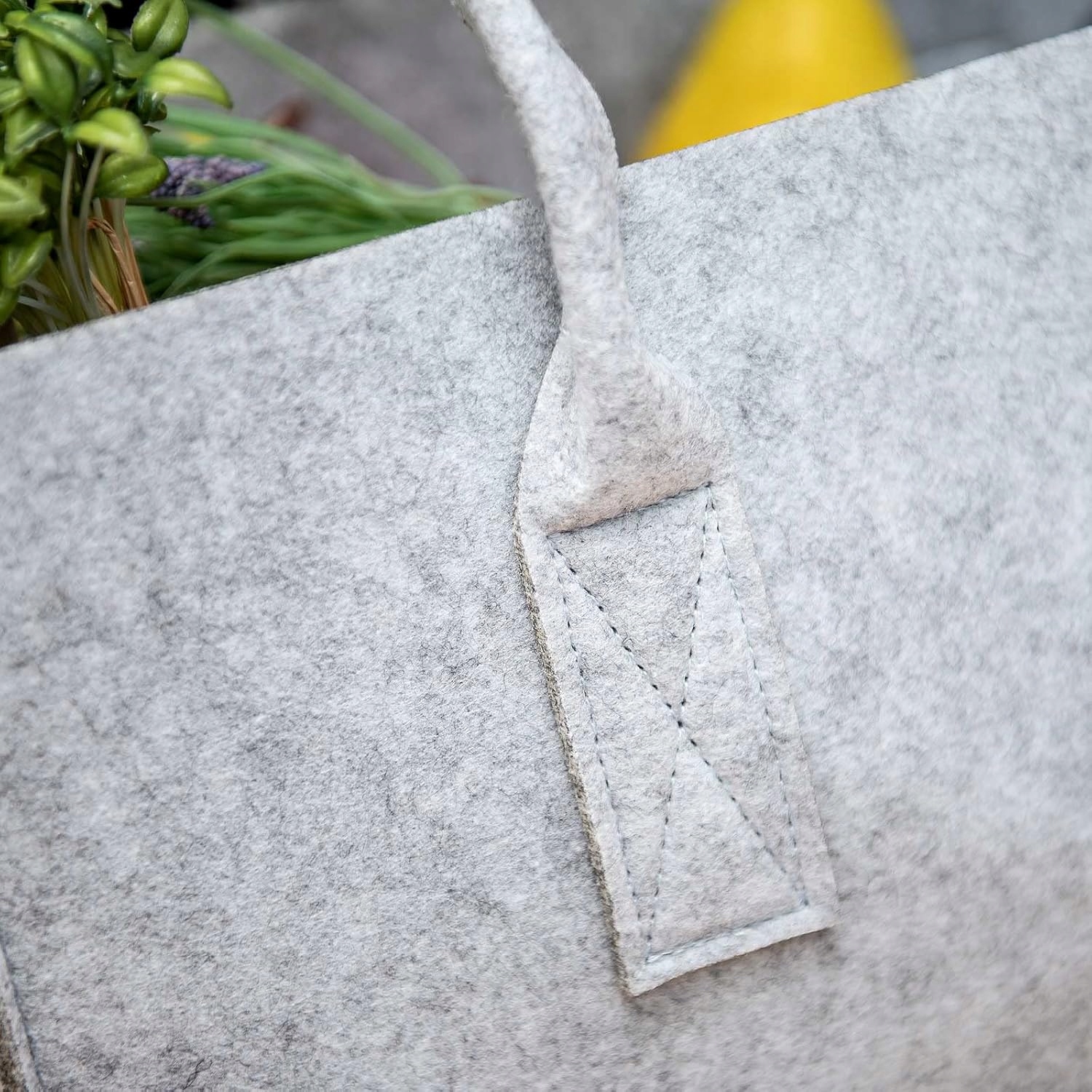 Сумка сумки виготовлена з фетру і зберігається у світло -сірому. Ручки, пришиті збоку, ідеально доповнюють дизайн елегантного супутника покупок. Чоловіки також можуть носити цю сумку ідеально