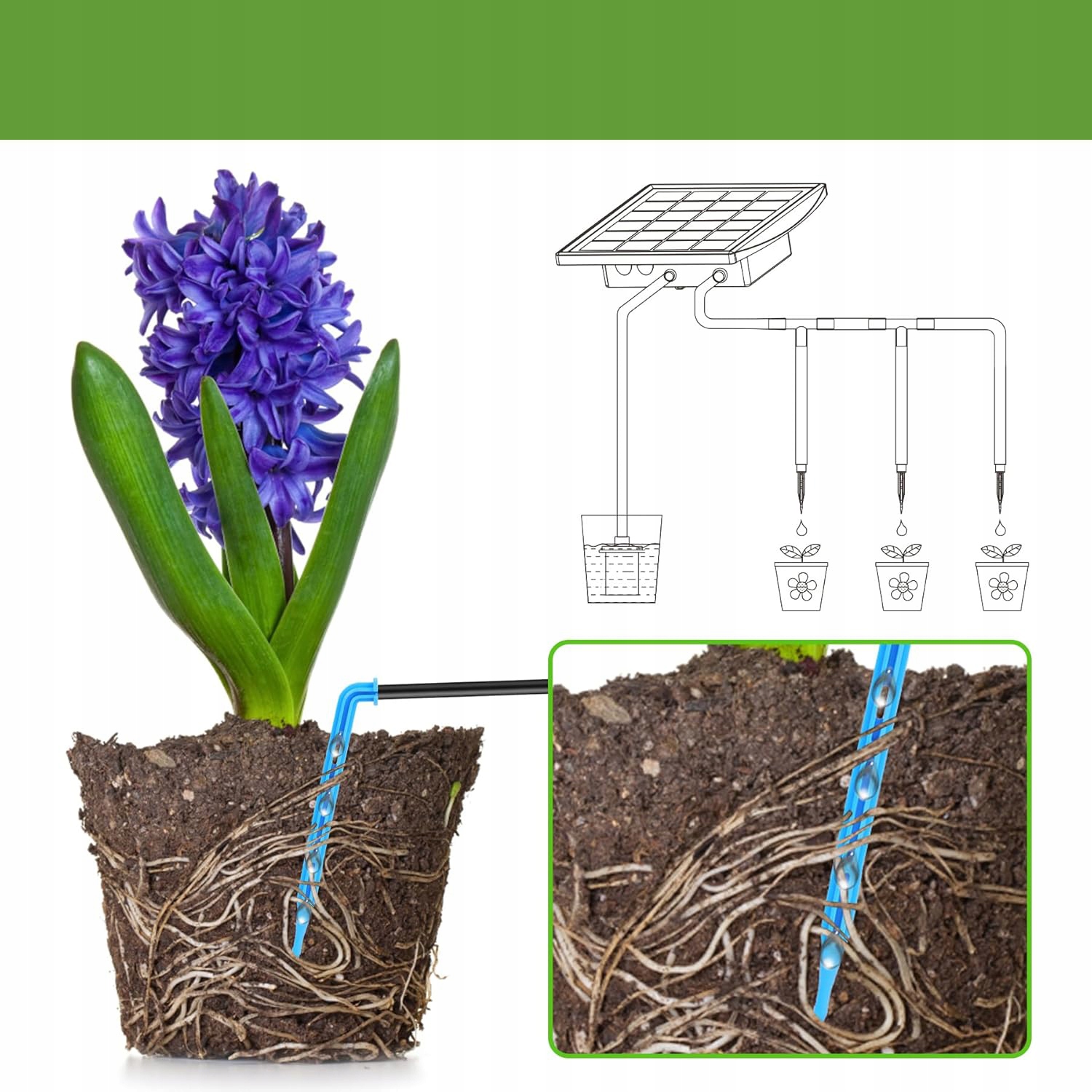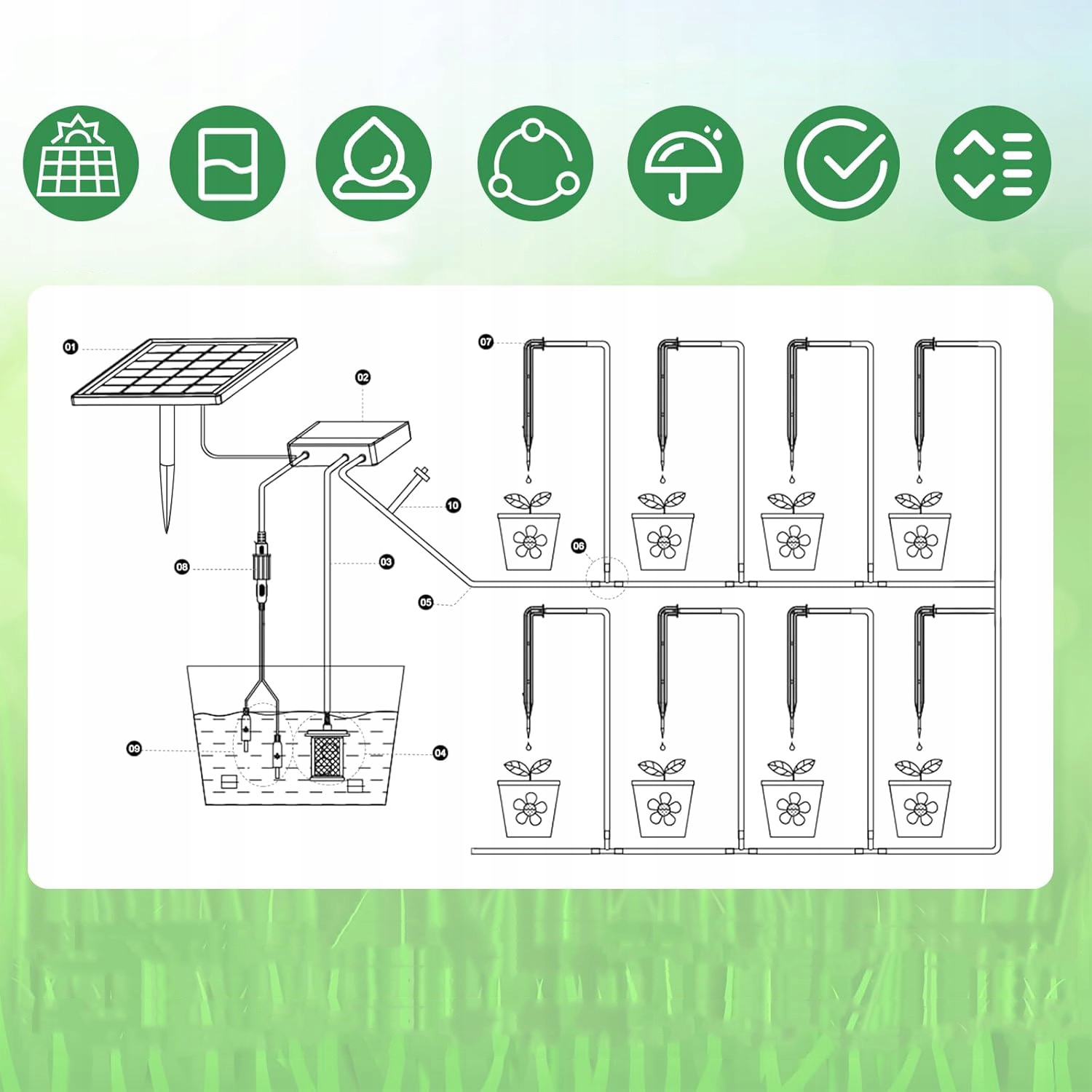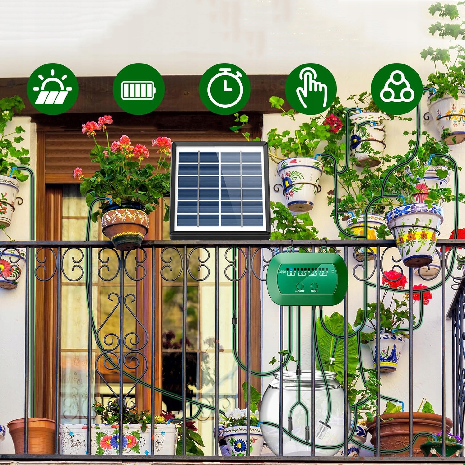 Автоматична система сонячного зрошення з 12 режимами регульованого таймера, час поливу - 5/10/15/20/30 хвилин , а частота поливу - 12/24/48/72 годин . Порівняно з традиційним зрошенням крапельки, було додано 6 режимів зрошення крапель, що економить щонайменше 90% води, що не тільки більш наукове та зручне, але й економить багато води.