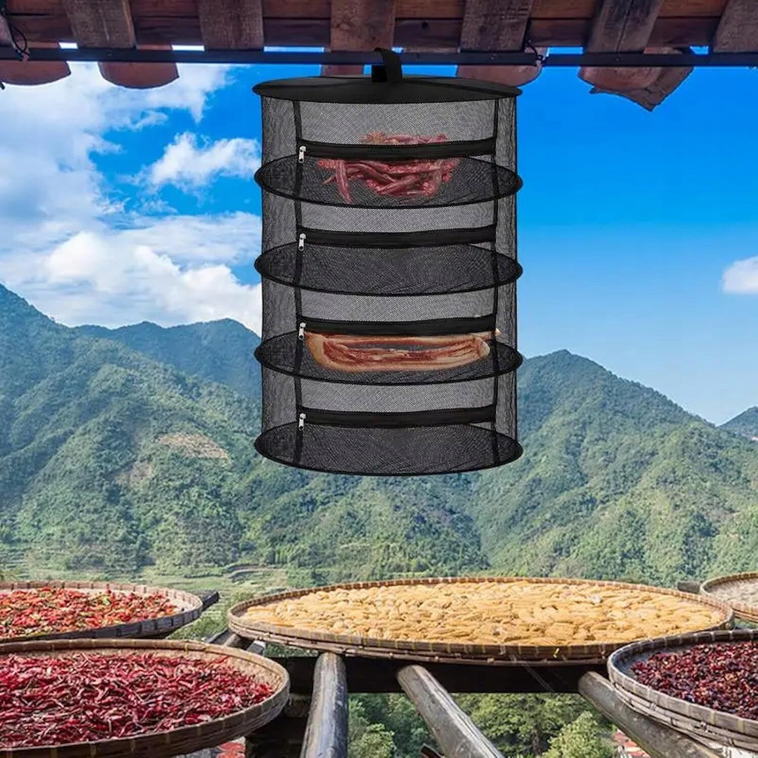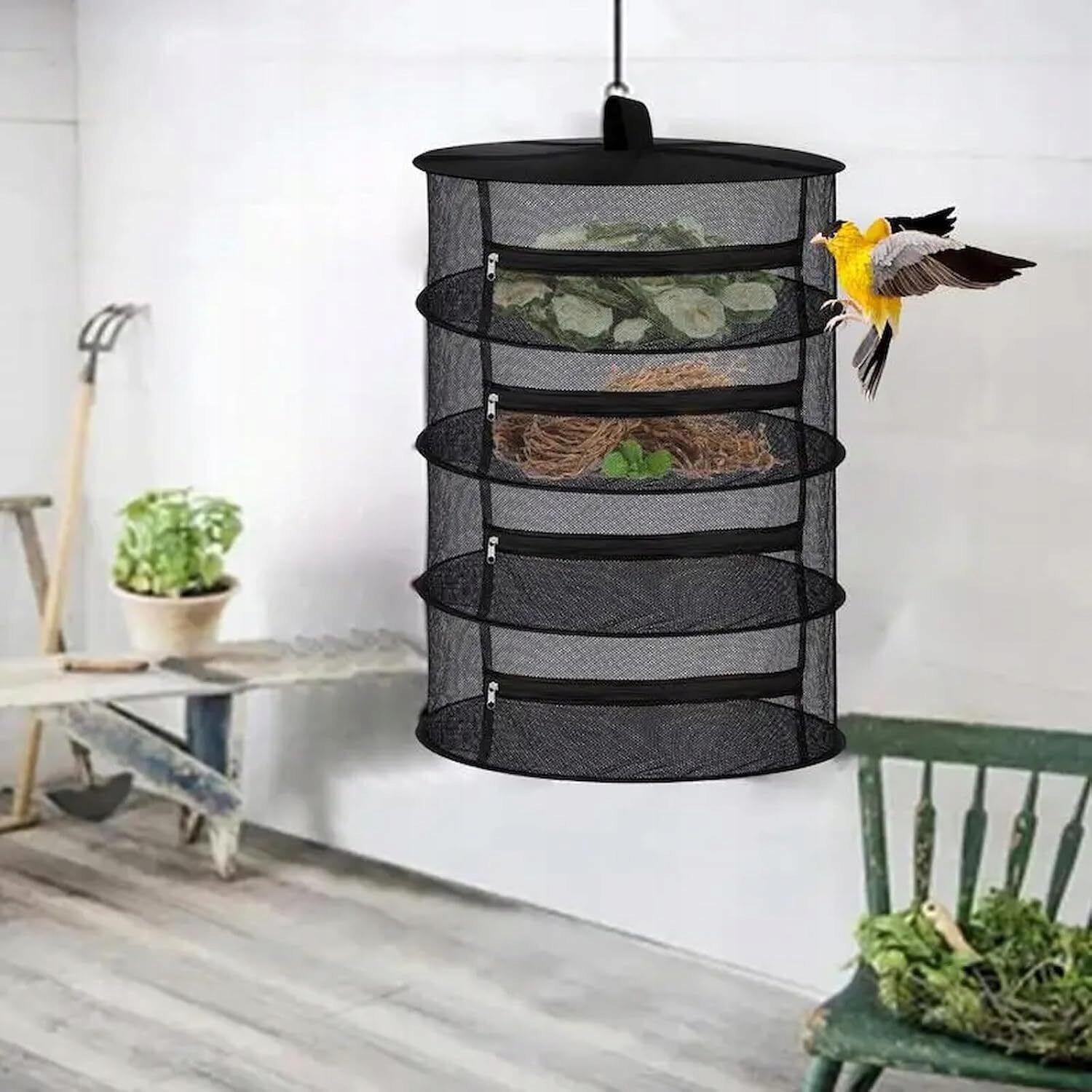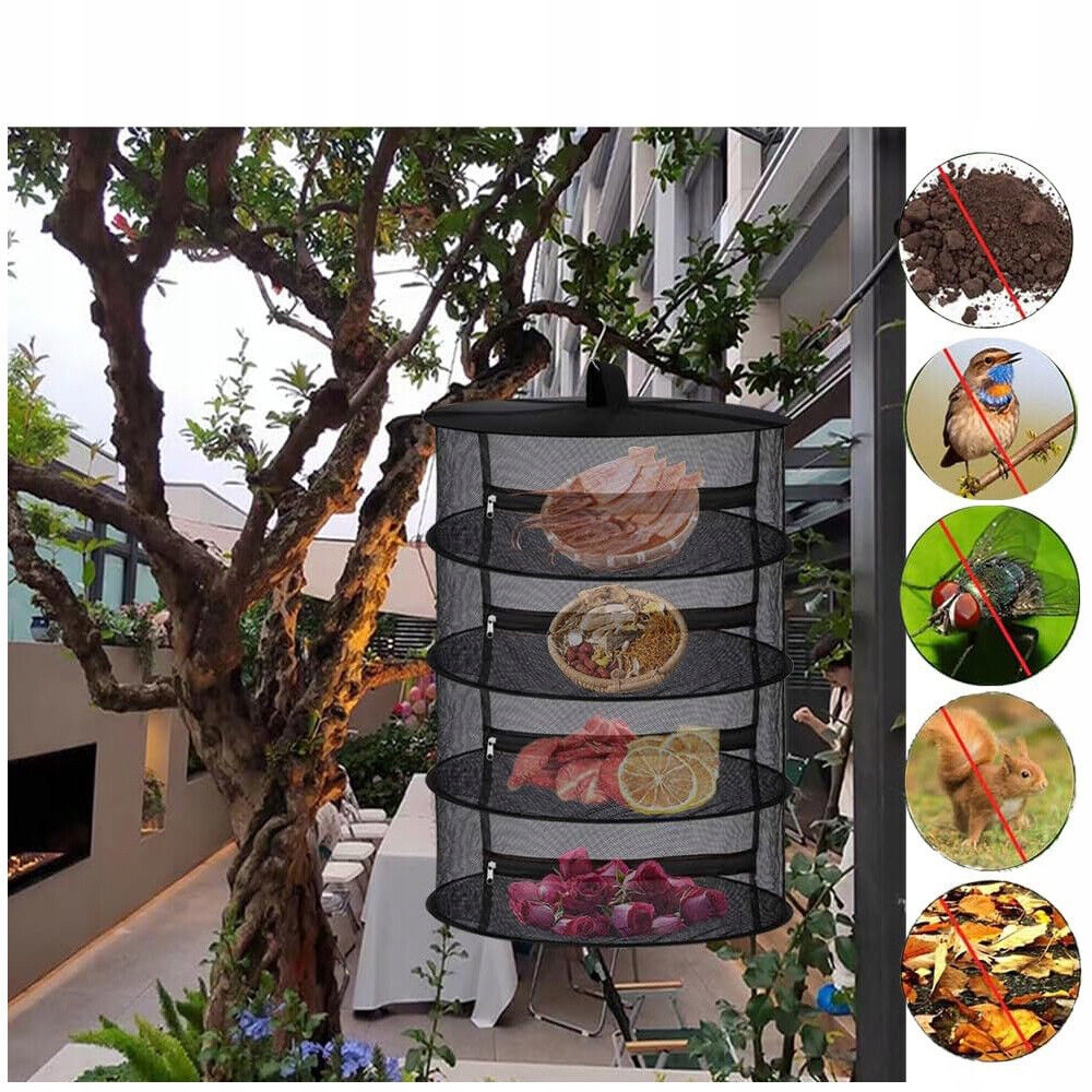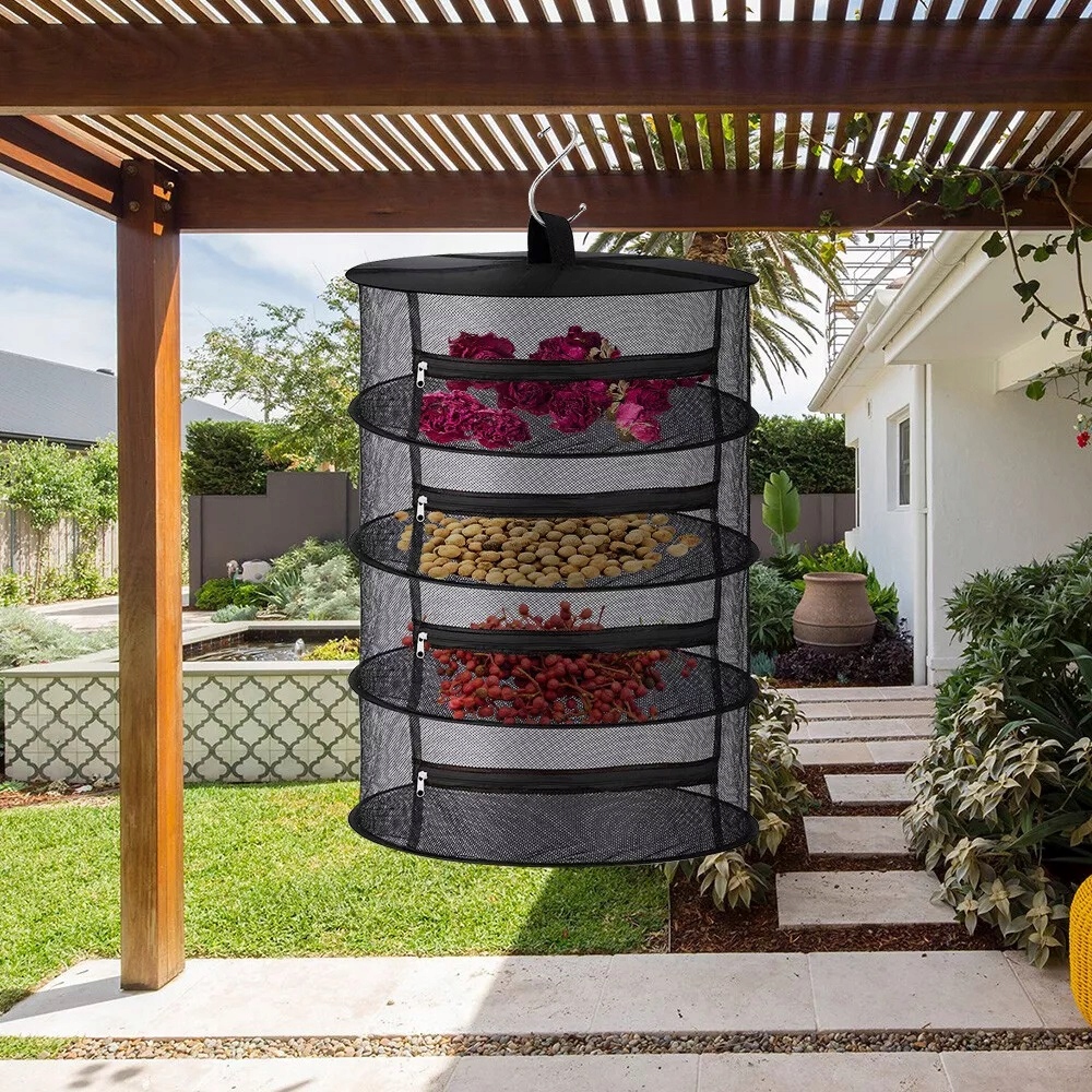 -a шар висячої сітки для сушіння має блискавку, яку можна легко відкрити та закрити, створюючи закритий простір для сушіння рослин. Це може не лише забезпечити, щоб рослини не турбували сильний вітер, але й запобігти потраплянню маленьких тварин та птахів.