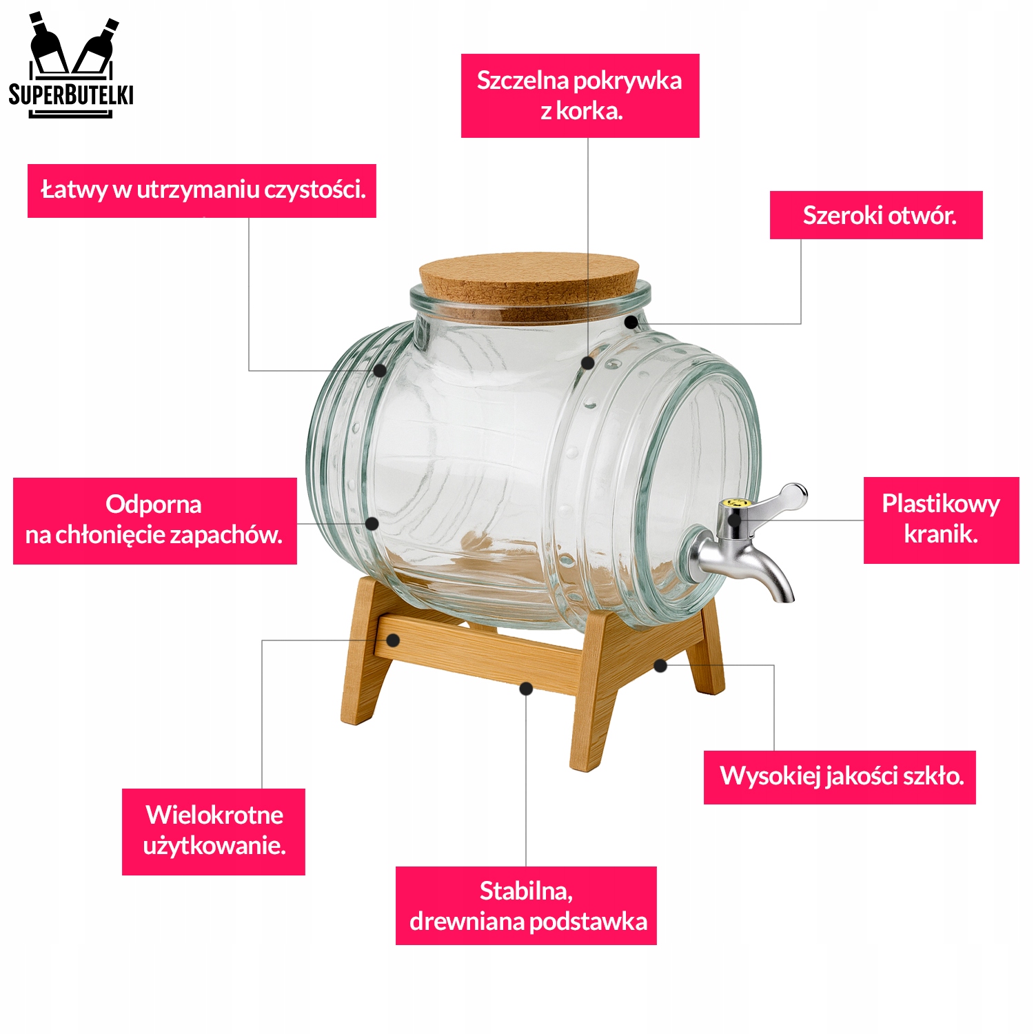 · ПРИМІТКА: Ми люб’язно повідомляємо вам, що бочки формуються вручну, а це означає, що вони можуть (але не повинні): натуральні бульбашки повітря та безбарвні смуги або лінії, що розбивають світло. Отвір крана просвердлюється, а це означає, що навколо нього можуть виникати невеликі стружки, що не повинно бути видно після встановлення крана. До першого використання рекомендується мити бочку теплою водою з додаванням дезінфекційних препаратів, наприклад. Натрій/калієвий піросиарцин. Не вливайте окропу в бочку і уникайте швидких змін температури для підтримки скла. Колір дерев'яної підставки може відрізнятися від відтінку, представленого на фотографії, залежно від приладдя виробника.