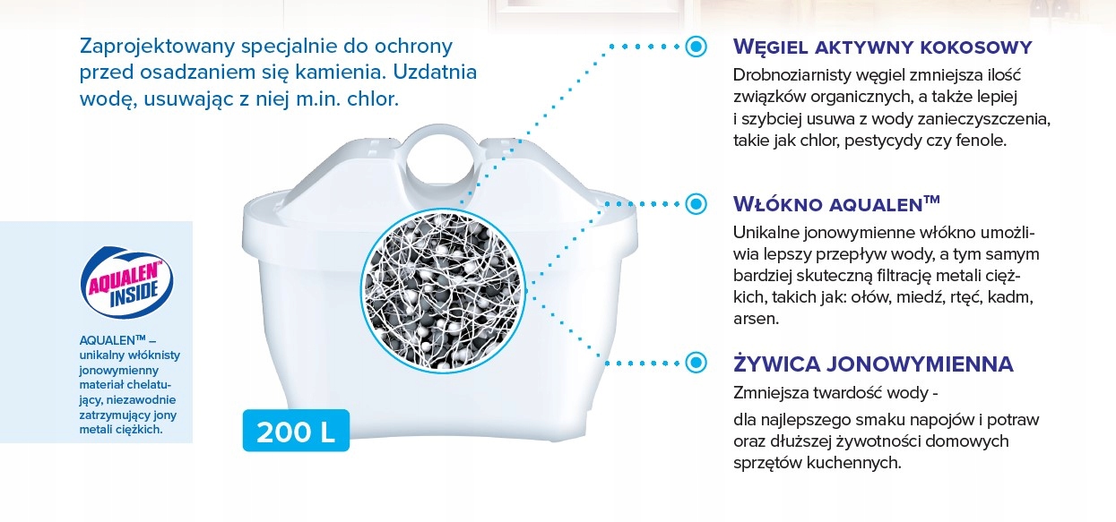 Фільтр-картридж AQUAPHOR Maxfor+ містить волокно Aqualen, завдяки якому воно ефективно видаляє іони важких металів (наприклад, ртуті, свинцю), а також видаляє, серед іншого, з води. хлору, фенолу, пестицидів, заліза, усуваючи неприємний смак і запах води.